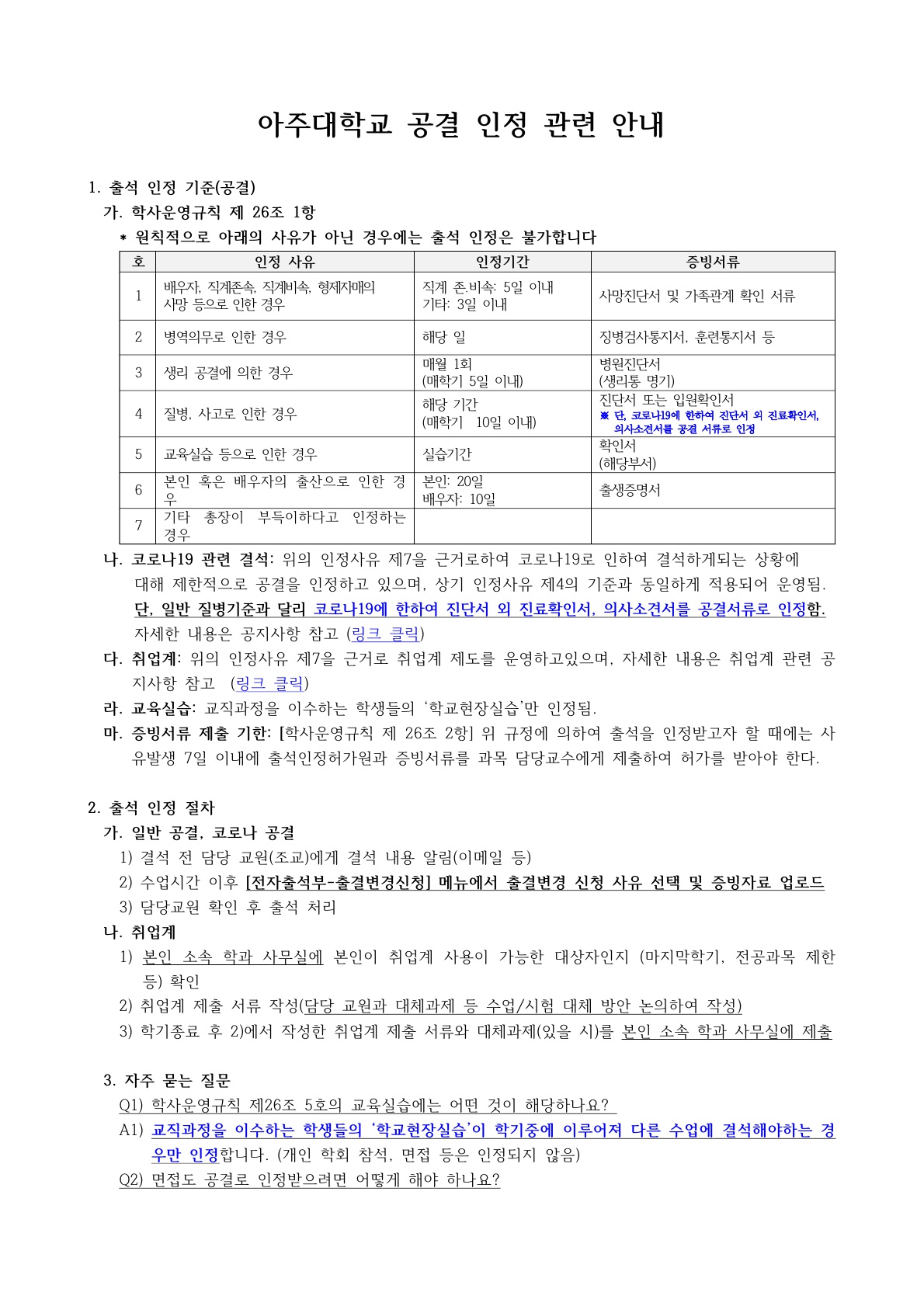 안녕하세요 아주대학교 출석 및 공결 관련 안내드립니다.