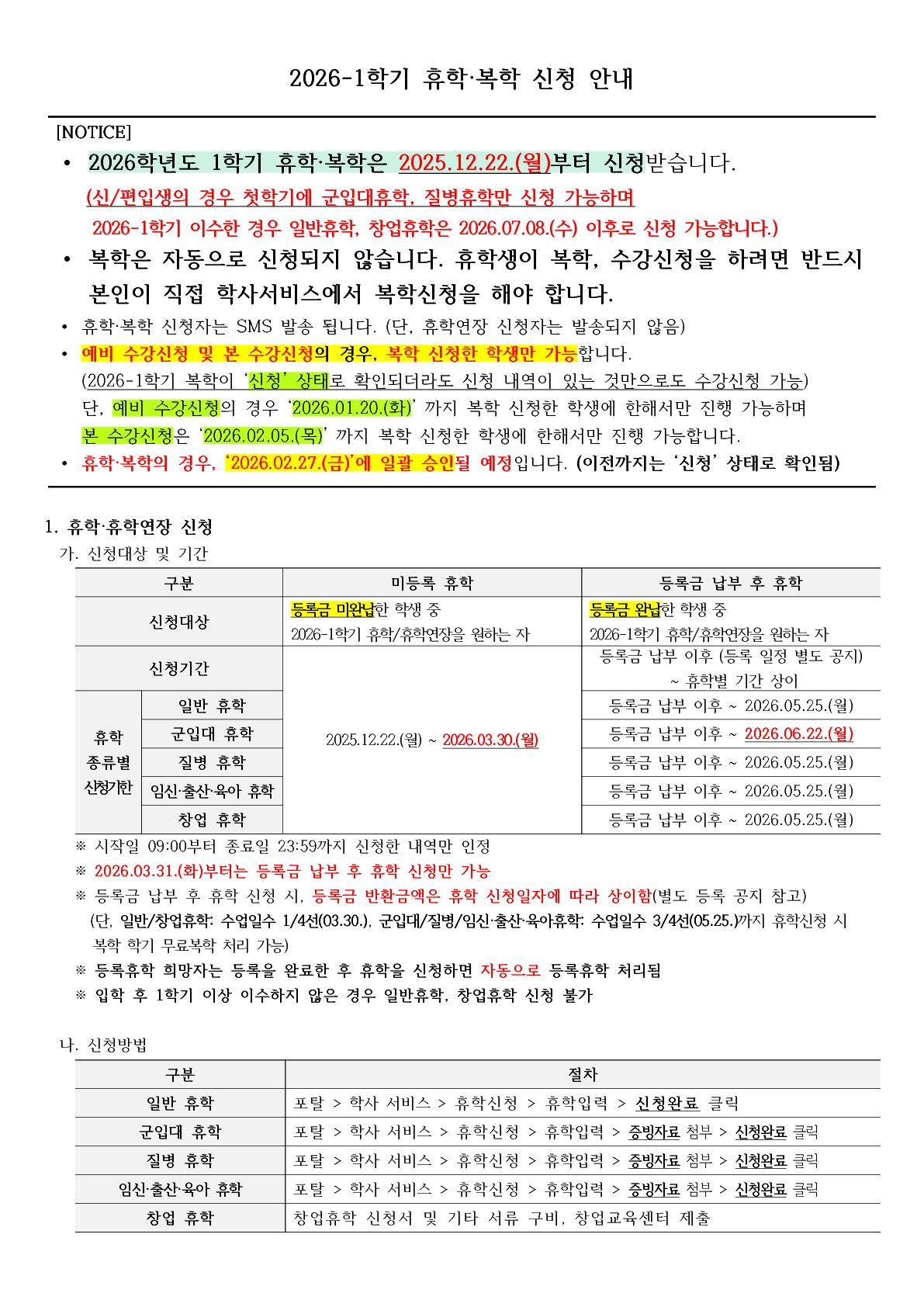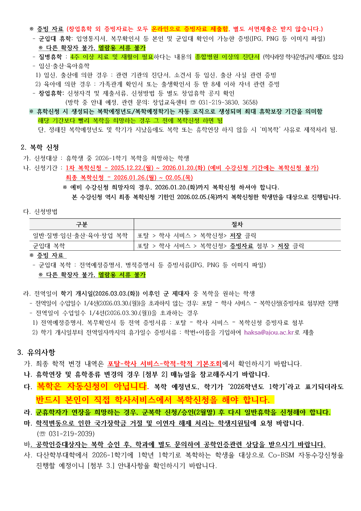 홈 ajou 공지 [학사] 2026-1학기 휴학/복학 신청 안내(12.11. 수정) ajou 공지 학사공지 교무팀 [학사] 2026-1학기 휴학/복학 신청 안내(12.11. 수정) 작성자: 교무팀 게시일: 2025. 12. 4. 오후 3:00:00 12.11. 수정내용: 증빙 자료 중 질병휴학 내용 수정 첨부파일 notice.do notice.do notice.do notice.do