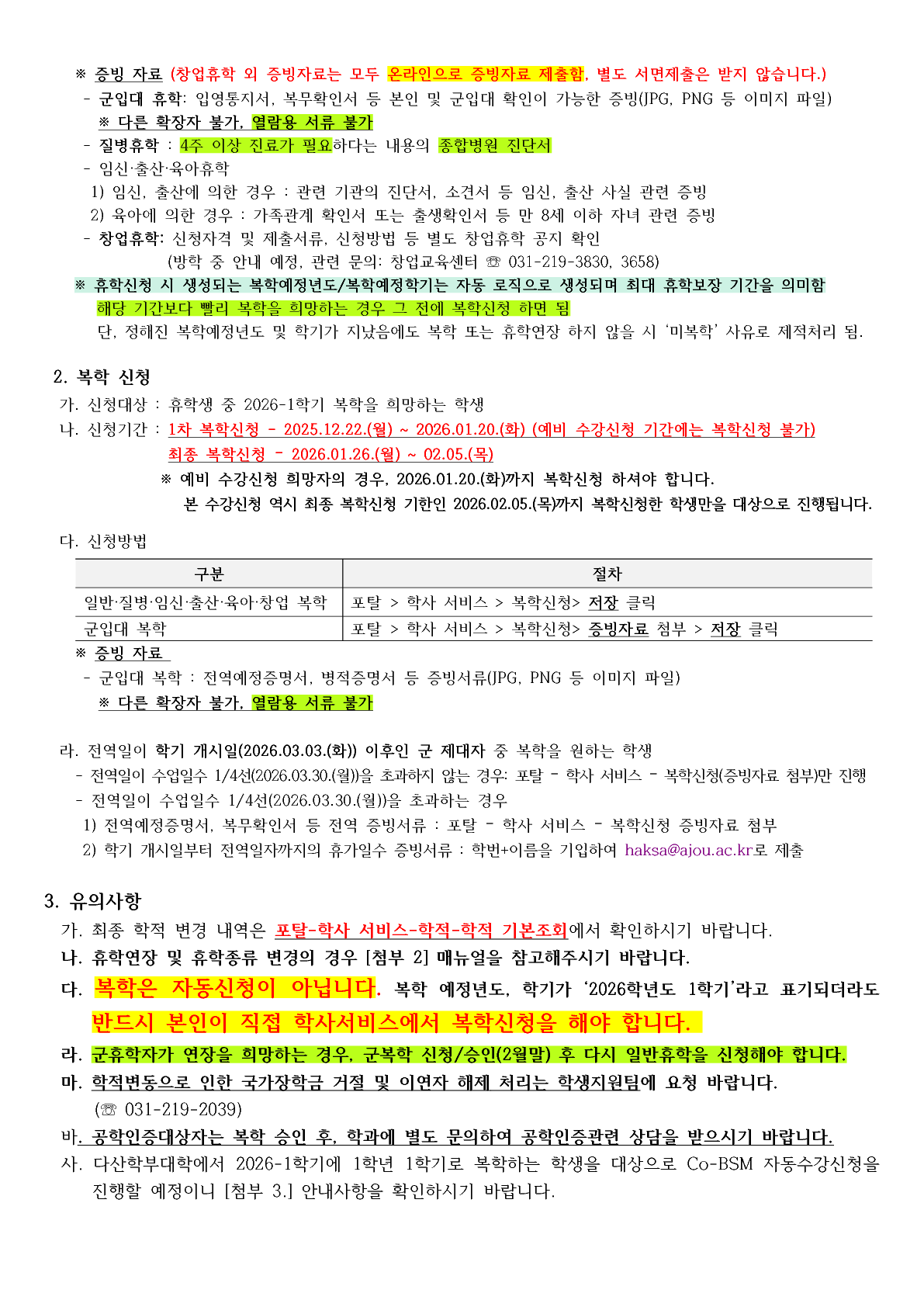 홈 ajou 공지 [학사] 2026-1학기 휴학/복학 신청 안내 ajou 공지 학사공지 교무팀 [학사] 2026-1학기 휴학/복학 신청 안내 작성자: 교무팀 게시일: 2025. 12. 4. 오후 3:00:00 첨부파일 notice.do notice.do notice.do notice.do