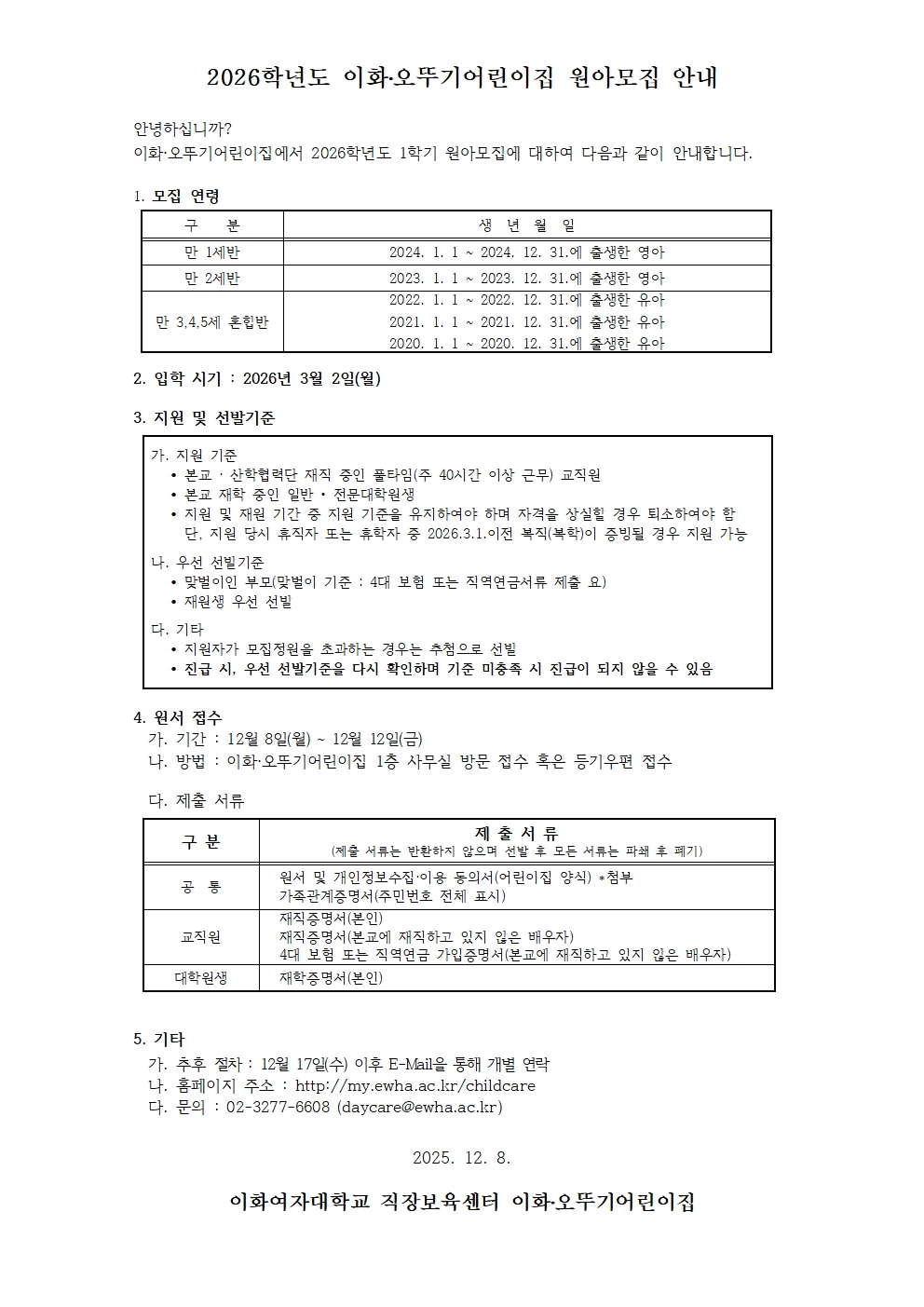 홈 ewha 일반 [직장보육센터] 2026학년도 이화오뚜기어린이집 원아 모집 안내 ewha 일반 직장보육센터 [직장보육센터] 2026학년도 이화오뚜기어린이집 원아 모집 안내 작성자: 작성처직장보육센터 게시일: 2025. 12. 8. 오전 12:00:00 첨부파일 프로필 1_2026_입학원서(공통).hwp 2_개인정보수집_및_이용동의서(공통).hwp 대학정보공시