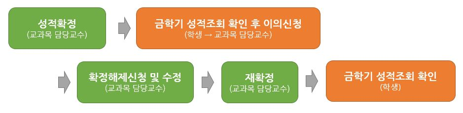 | 교과목담당교수 | 1. 연락처 사전 공지 - 이의신청 접수할 연락처(메일, 전화번호 등) 공지2. 성적이의신청 접수 및 검토 - 학생의 성적 및 정정 필요여부 확인3. 성적수정(성적확정 해제) 신청 - 사무착오 사유에 해당하는 경우4. 성적수정 및 재확정 |