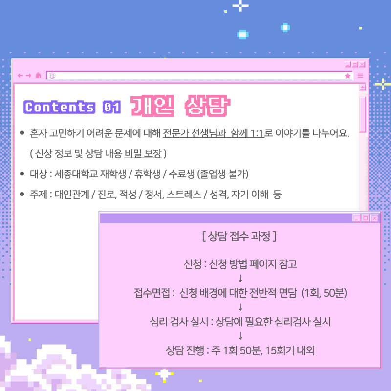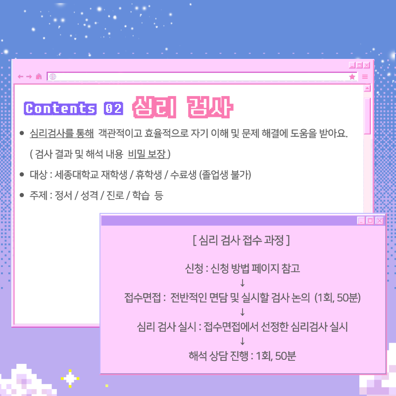 세종대학교 재학생이라면, 누구나 무료로 심리 상담 및 심리 검사를 받아볼 수 있습니다. (대학생, 대학원생 모두 가능)