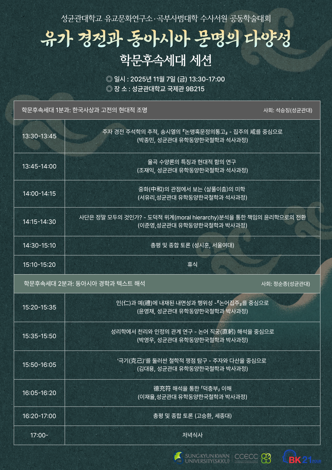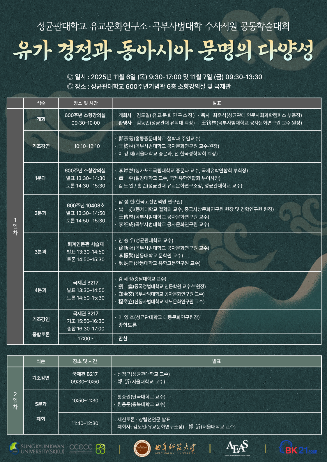◎ 주제 : 유가 경전과 동아시아 문명의 다양성 ◎ 일시 : 2025년 11월 6일 (목) 9:30-17:00 및 11월 7일 (금) 09:30-13:30 ◎ 장소 : 성균관대학교 600주년기념관 6층 소향강의실 및 국제관 ◎ 주최 : -성균관대학교 유교문화연구소 비판유학 현대경학 연구센터 -유학동양한국철학과 유학전공 -대동문화연구원 -유학동양한국철학과 BK21 교육연구단 -곡부사범대학(曲阜師範大學) 수사서원(洙泗書院) -동아경학창립준비위원회