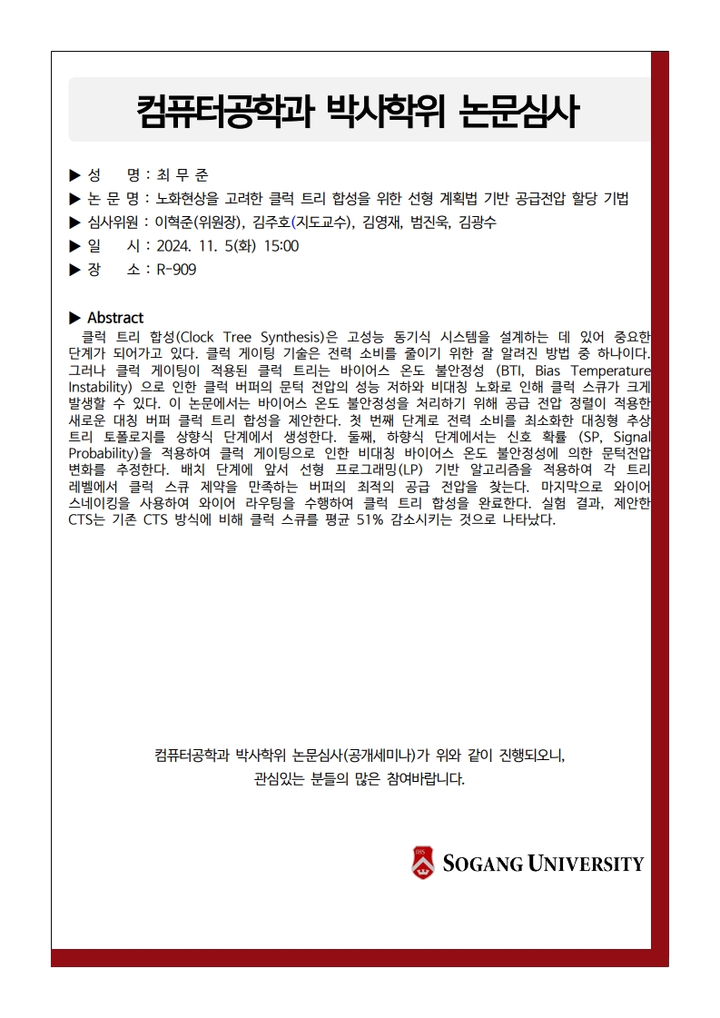 홈 sogang-cs 대학원공지 박사학위 논문심사 공개세미나 공지_최무준_24.11.05 sogang-cs 대학원공지 컴퓨터공학과 컴퓨터공학과 박사학위 논문심사 공개세미나 공지_최무준_24.11.05 작성자: 컴퓨터공학과 게시일: 2024. 11. 2. 오전 10:37:22