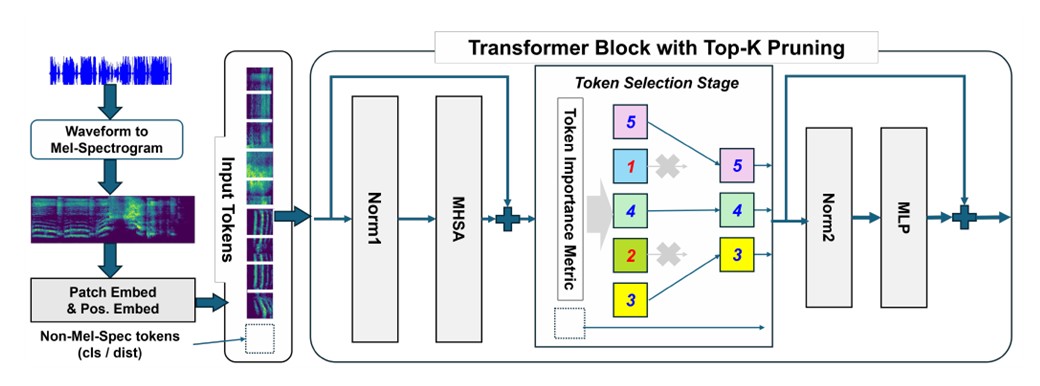 본 연구는 Transformer 기반 오디오 분류 모델에 Attention-score를 기반으로 각 토큰의 중요도를 평가하여 Token pruning을 적용하여 약 1% 미만의 정확도 손실을 유지하며 모델 추론 시 연산량을 (MAC) 30-40% 감소시켰다. 또한 정량적 분석으로 토큰들의 Attention-score가 상응하는 Mel-spectrogram patch의 에너지와 양적 상관관계를 보이긴 하나, 낮은 에너지를 가진 영역에서 생성된 토큰들 또한 제거된 Token에 비하여 상당한 Attention-score를 받으며 이들의 존재가 오디오 분류 과정에서 필수적인 역할을 하는 것을 검증하였다.