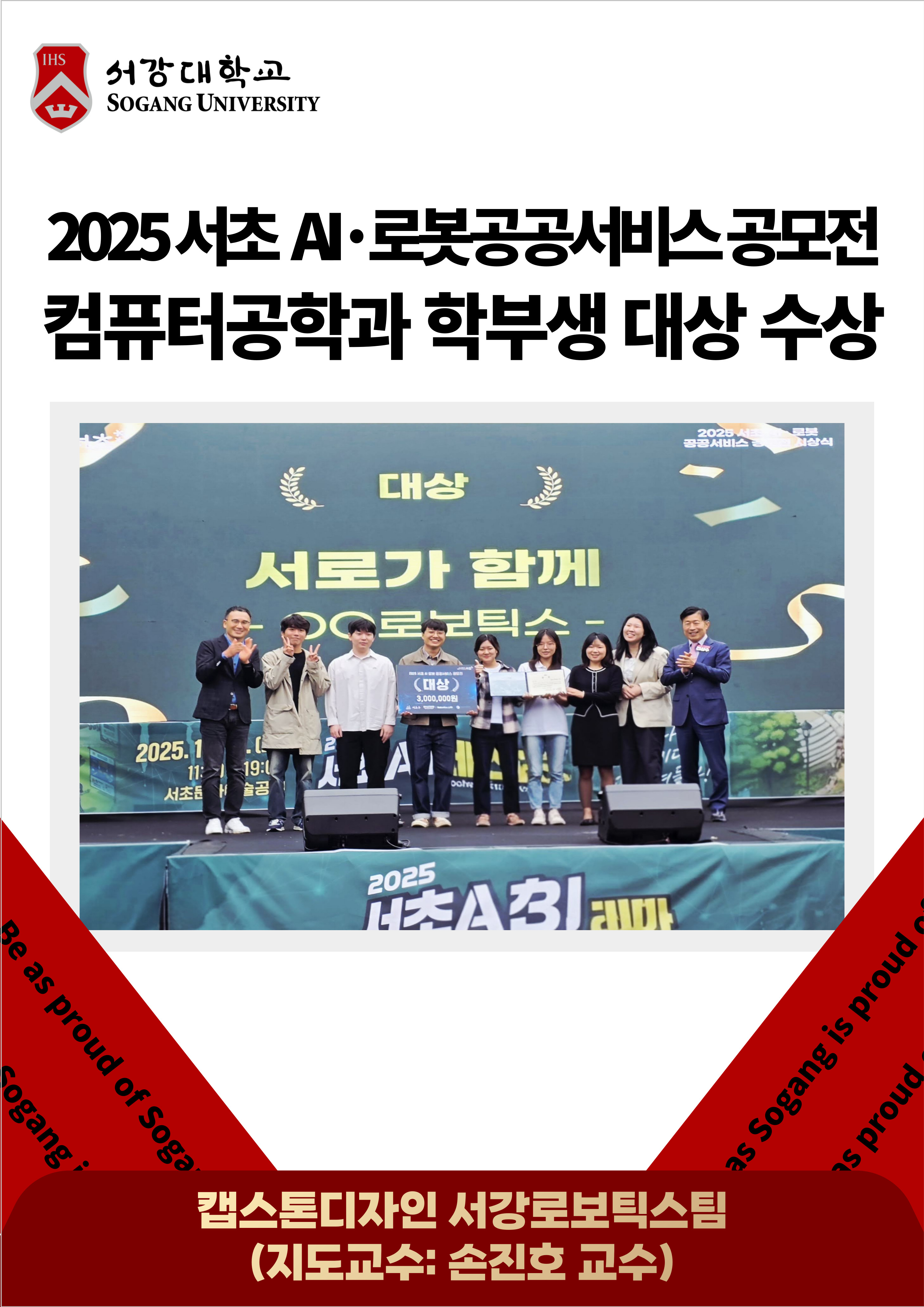 2025년 10월 18일 열린 2025 서초 AI·로봇 공공서비스 공모전에서 본과 학부생으로 구성된 서강로보틱스(지도교수: 손진호 교수) 팀이 대상(서초구청장상)을 수상했습니다.