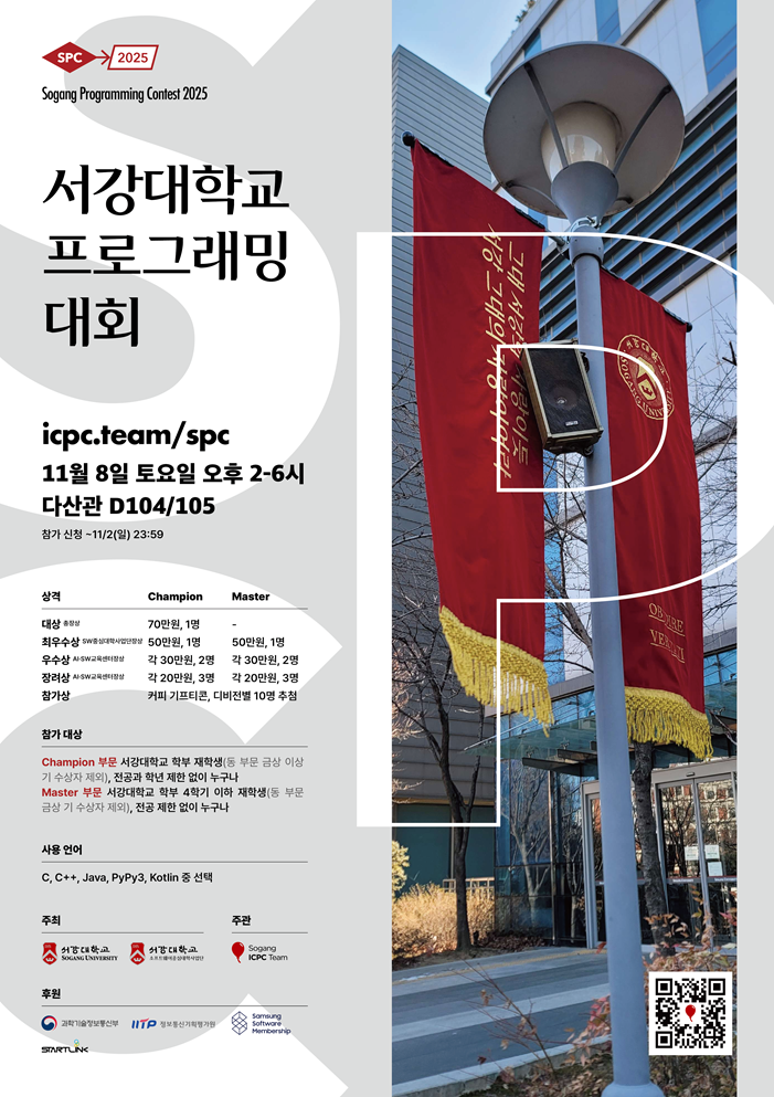 홈 sogang-cs 주요공지 서강 프로그래밍 대회 참가 신청 안내(~11/2) sogang-cs 주요공지 컴퓨터공학과 컴퓨터공학과 서강 프로그래밍 대회 참가 신청 안내(~11/2) 작성자: 컴퓨터공학과 게시일: 2025. 10. 29. 오전 5:51:37 참가신청: https://icpc.team/spc-25-apply