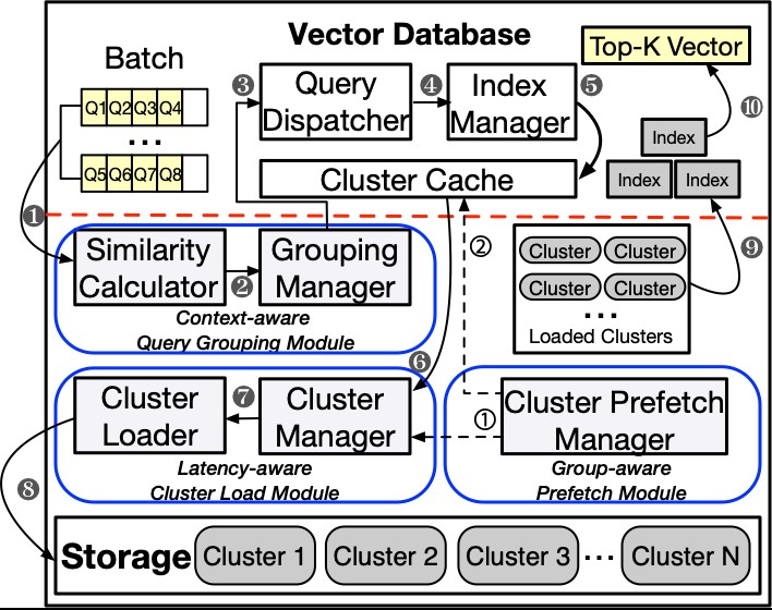 본 연구팀은 벡터 데이터베이스에서 사용되는 기존 인덱스 군집 캐싱 정책의 성능적 한계를 분석하고, 캐시 활용률을 극대화하기 위한 CALL을 제안하였습니다. CALL은 쿼리 별 인덱스 군집 집합의 유사도를 런타임에서 계산하여 군집이 겹치는 비율이 높은 쿼리들을 그룹으로 묶고 검색 순서를 재배치하였습니다. 또한, 그룹 내 쿼리 별 인덱스 군집 분포를 기반으로 쿼리 그룹이 바뀌기 전 비동기 군집 프리페칭 기법을 통해 다음 쿼리 그룹의 첫번째 쿼리가 탐색하는 인덱스 군집을 미리 캐시에 로드하여 캐시 적중률을 향상시켰습니다.