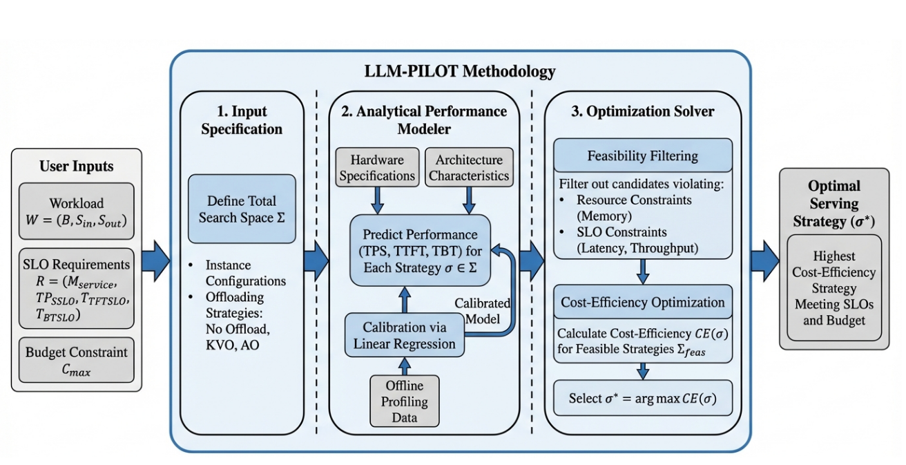 본 연구팀이 개발한 LLM-PILOT은 이러한 클라우드의 복잡한 다차원 최적화 문제를 체계적으로 해결하는 프레임워크입니다. 시스템은 워크로드 특성(배치 크기, 입출력 시퀀스 길이), 서비스 수준 목표(SLO: 처리량, 지연시간), 예산 제약을 입력받아, 오프로딩 전략과 클라우드 인스턴스 조합을 최적화합니다. 프레임워크의 핵심은 계층적 분석 모델 입니다. LLM 추론을 1. Compute, 2. Memory, 3. Transfer라는 세 가지 하드웨어 독립적 함수로 추상화하고, KV Cache Offloading과 Attention Offloading등 각 오프로딩 전략에 따른 성능 병목을 수학적으로 예측합니다. 나아가 선형 회귀 기반 보정 단계를 통해 실제 하드웨어의 차이를 수학적으로 반영하여 예측 정확도를 더욱 높였습니다.