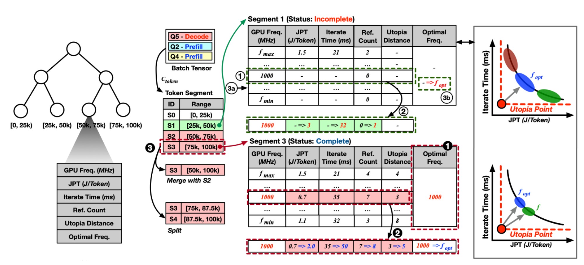 본 연구는 이러한 한계를 극복하기 위해, LLM 추론의Iteration 단위 실행 특성을 실시간으로 분석하여 에너지와 지연 시간 간의 최적 균형점을 동적으로 탐색하는GPU 주파수 제어 프레임워크QUICKTOPIA를 제안합니다. QUICKTOPIA는 모델 구조 수정이나 오프라인 프로파일링 없이 런타임 변동성에 즉각적으로 적응하며, 다목적 최적화 개념인 파레토 최적성(Pareto Optimality)을 기반으로Latency와Energy라는 상충 목표 간의 최적 트레이드-오프를 실시간으로 평가합니다. 또한, 트리 기반 세그먼트 매니저를 설계하여 제어 오버헤드를 최소화하고 노이즈가 존재하는 환경에서도 안정적인 주파수 정책을 유지함으로써, 실질적인 시스템 효율 극대화를 달성합니다.