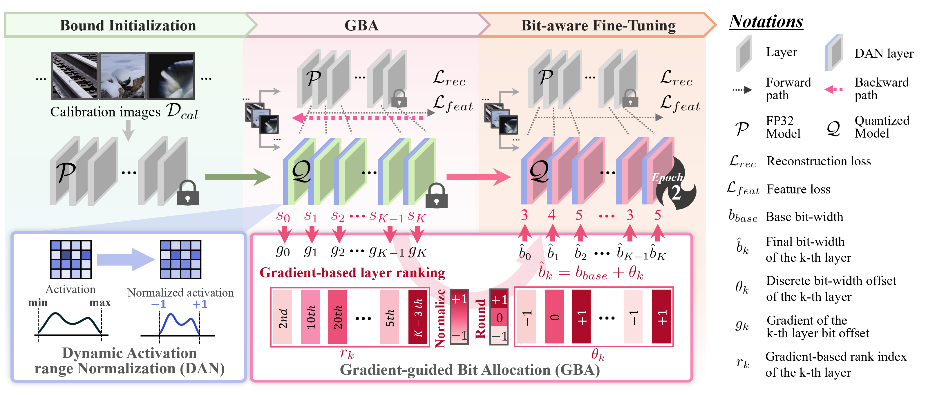 연구팀은 이를 완화하기 위해 PTQ 기반 Mixed-Precision Quantization(MPQ) 프레임워크를 제안하며, 핵심은 (i) Gradient-guided Bit Allocation (GBA): bit-width에 대한 loss gradient로 레이어별 양자화 민감도를 직접 추정해 bit를 배분하고, (ii) Bit-aware fine-tuning: GBA로 정한 bit-width를 고정한 뒤 가중치/activation의 quant range를 학습으로 재조정하며, (iii) Dynamic Activation Range Normalization (DAN): 샘플·채널별 activation을 정규화한 후 양자화하고 다시 원 스케일로 복원해 clipping/범위 불균형을 줄이는 방법이다.