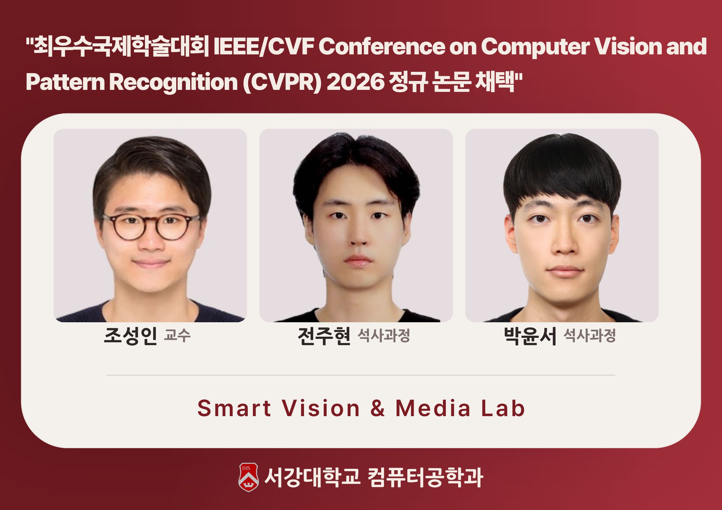 최우수국제학술대회 IEEE/CVF Conference on Computer Vision and Pattern Recognition (CVPR) 2026 정규 논문 채택