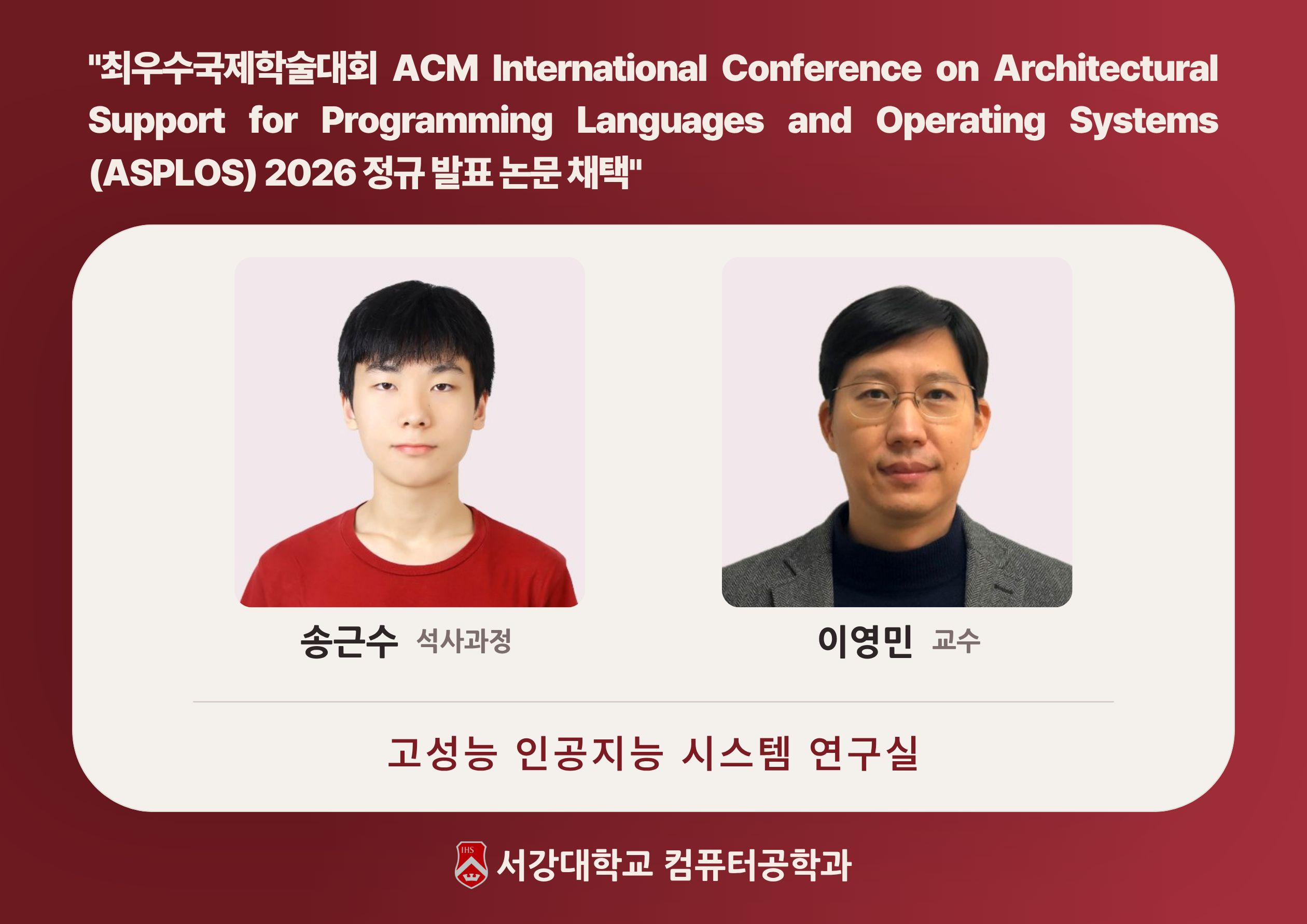 송근수 석사과정생(제1저자)과 이영민 교수(교신저자)의 논문이 시스템 소프트웨어 및 아키텍처 분야 최고 권위의 국제 학술대회인 ACM International Conference on Architectural Support for Programming Languages and Operating Systems (ASPLOS) 2026에 채택되었다. ASPLOS는 한국정보과학회 인정 최우수학술대회(BK 인정 IF=4)로, 2026년 3월 22일부터 3월 26일까지 미국 피츠버그에서 개최될 예정이다.