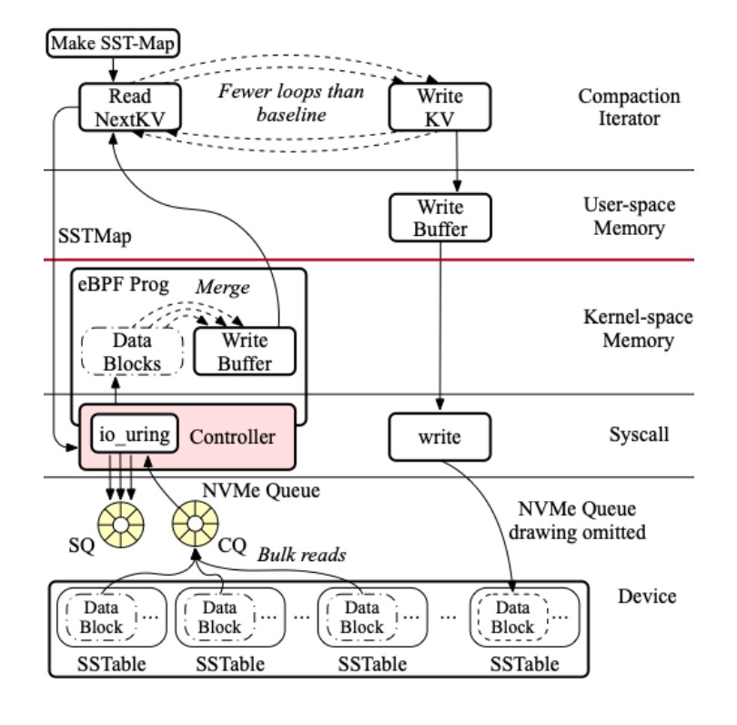 본 연구는 이러한 소프트웨어 스택에 있는 문제 의식에서 출발하여 새로운 하드웨어를 추가하거나 LSM-tree의 구조를 수정하는 대신, 소프트웨어 스택의 오버헤드를 경감하는 Resystance를 제안한다. Resystance는 Linux의 eBPF와 io_uring을 활용하여 compaction의 핵심 I/O 및 merge 경로를 커널 내부로 이동시킴으로써, 불필요한 사용자–커널 전환과 시스템 콜을 대폭 줄인다. 기존 데이터베이스 엔진의 구조는 유지하면서도, OS 내부 커널의 실행 경로를 제어하여 병목을 제거하는 방식이다.