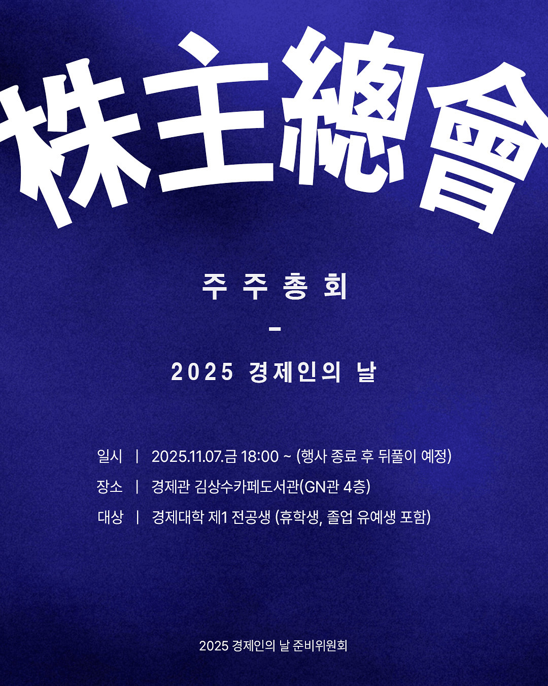 홈 sogang-econ 교육 및 홍보 2025 경제인의 날 행사 안내 (2025.11.7.) sogang-econ 교육 및 홍보 학부 및 일반대학원 공지 경제대학 2025 경제인의 날 행사 안내 (2025.11.7.) 작성자: 경제대학 게시일: 2025. 11. 5. 오후 12:29:37 문의 02-705-8179 인스타그램 @sogangecon_official 첨부파일 경제인의날 포스터.jpg