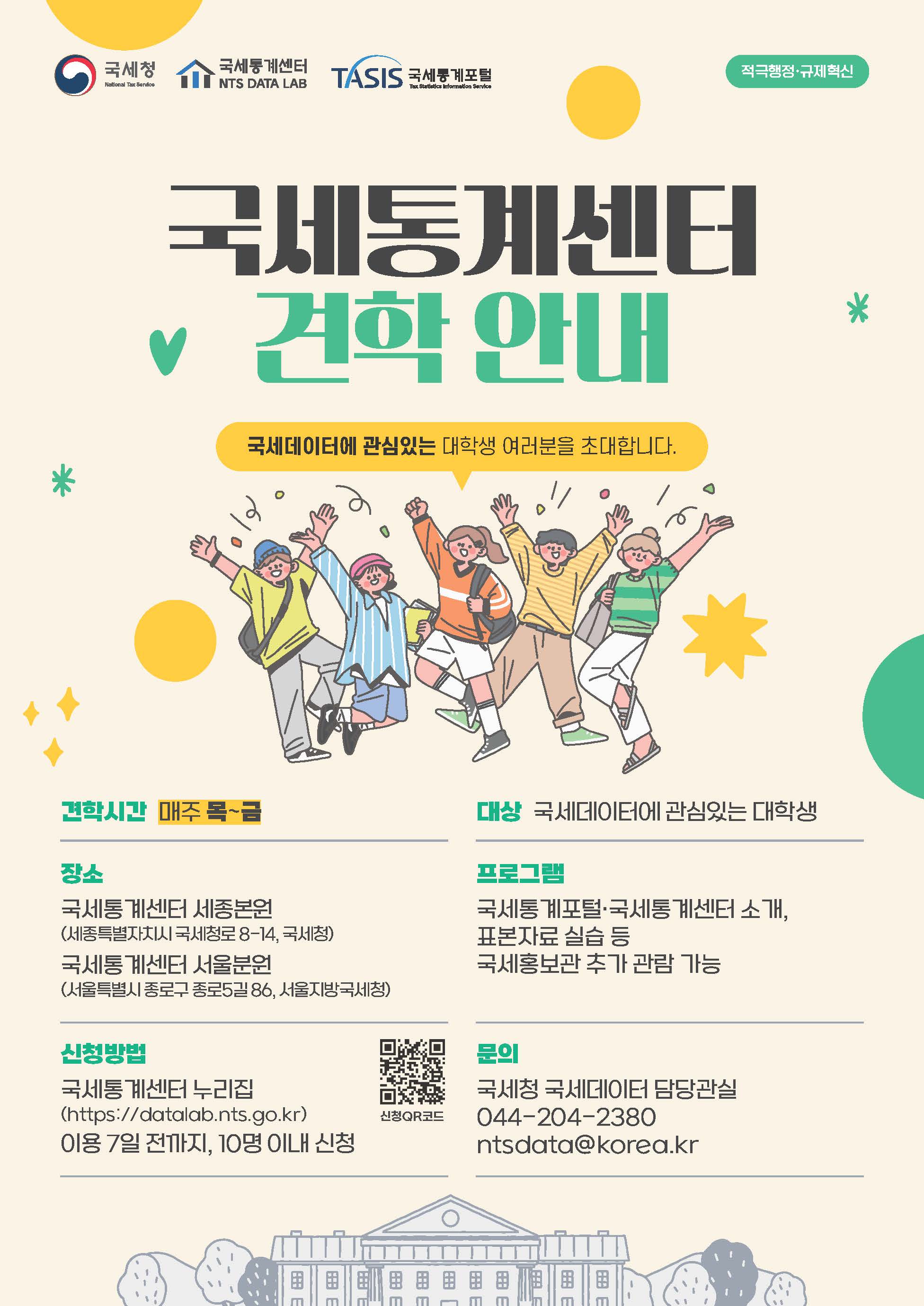 홈 sogang-econ 교육 및 홍보 국세통계센터 대학생 견학 프로그램 안내 sogang-econ 교육 및 홍보 학부 및 일반대학원 공지 경제대학 국세통계센터 대학생 견학 프로그램 안내 작성자: 경제대학 게시일: 2026. 3. 11. 오전 5:41:10 국세청의 국세통계센터 대학생 견학 프로그램 신청 방법을 안내드리오니 관심 있는 학생들의 많은 참여 바랍니다. 자세한 내용은 아래의 포스터와 첨부파일의 리플릿을 참고 바랍니다. 첨부파일 국세통계센터 대학생 견학 프로그램 안내 포스터.pdf 국세통계센터 홍보 리플릿.pdf