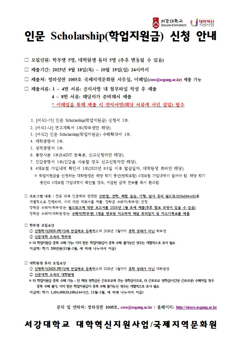 홈 sogang-eu 공지사항 인문 Scholarship (학업지원금) 신청 안내 sogang-eu 공지사항 인문 Scholarship (학업지원금) 신청 안내 작성자: 특성화사업단 게시일: 2025. 10. 1. 오전 12:00:00 첨부파일 file file file