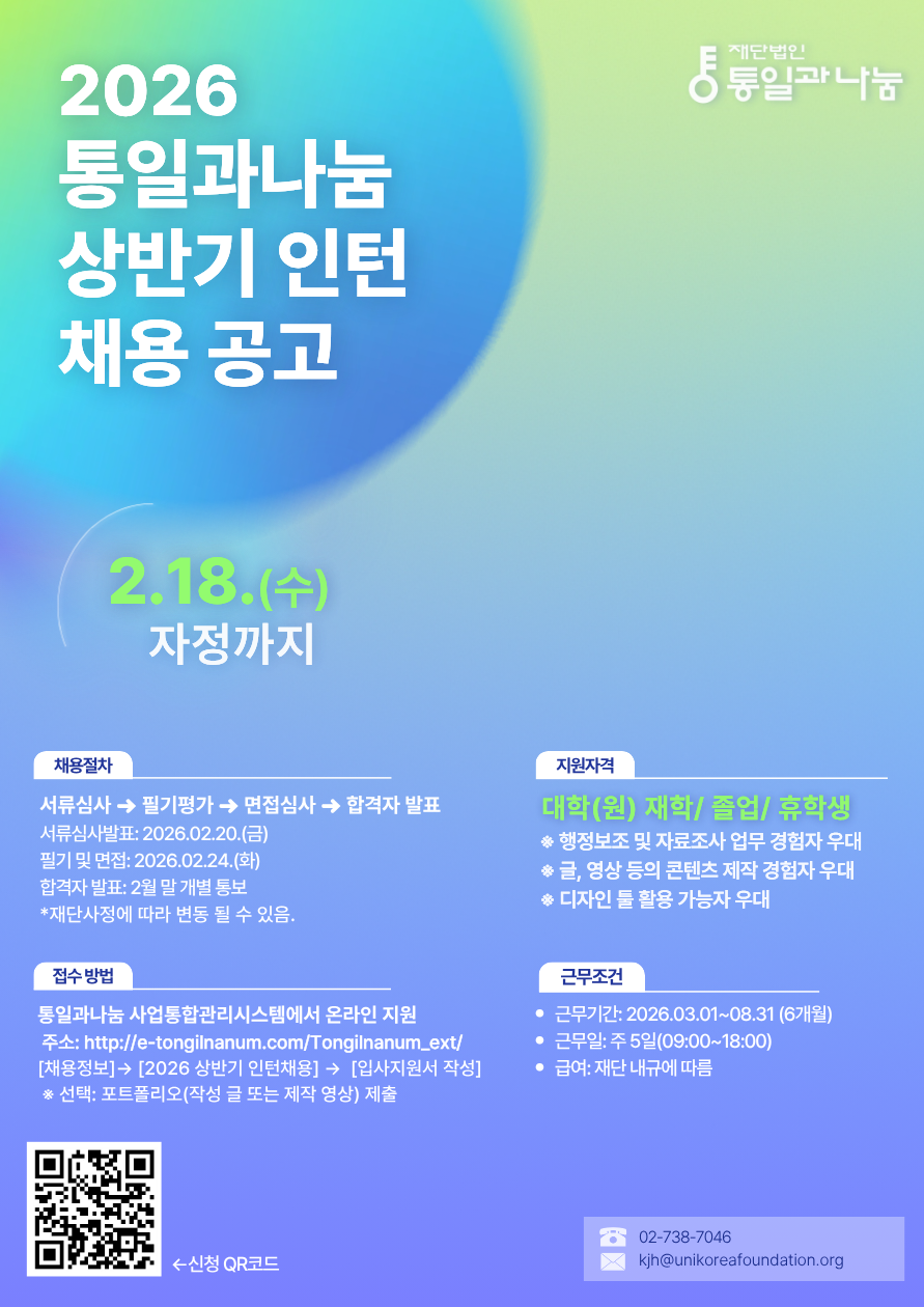 [재단법인 통일과나눔] 2026 상반기 인턴 채용(~2/18)