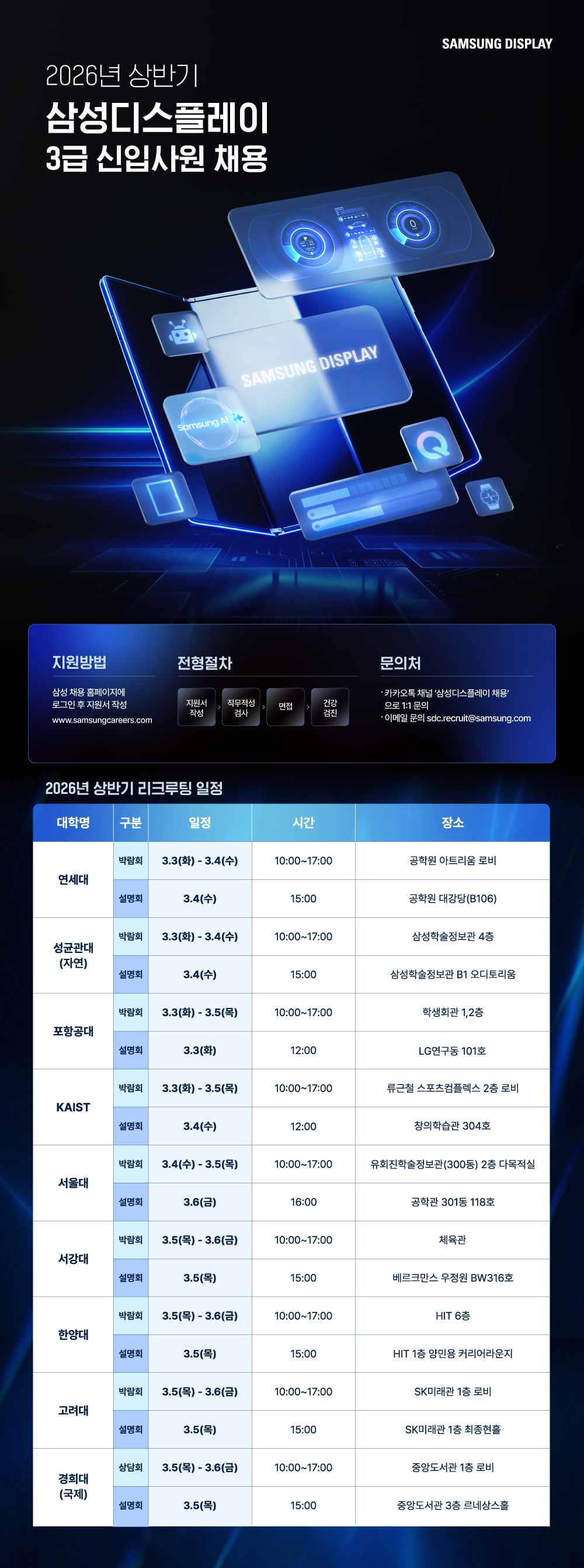 홈 sogang-eu 공지사항 2026년 상반기 삼성디스플레이 리크루팅 일정 sogang-eu 공지사항 2026년 상반기 삼성디스플레이 리크루팅 일정 작성자: 특성화사업단 게시일: 2026. 2. 24. 오전 12:00:00