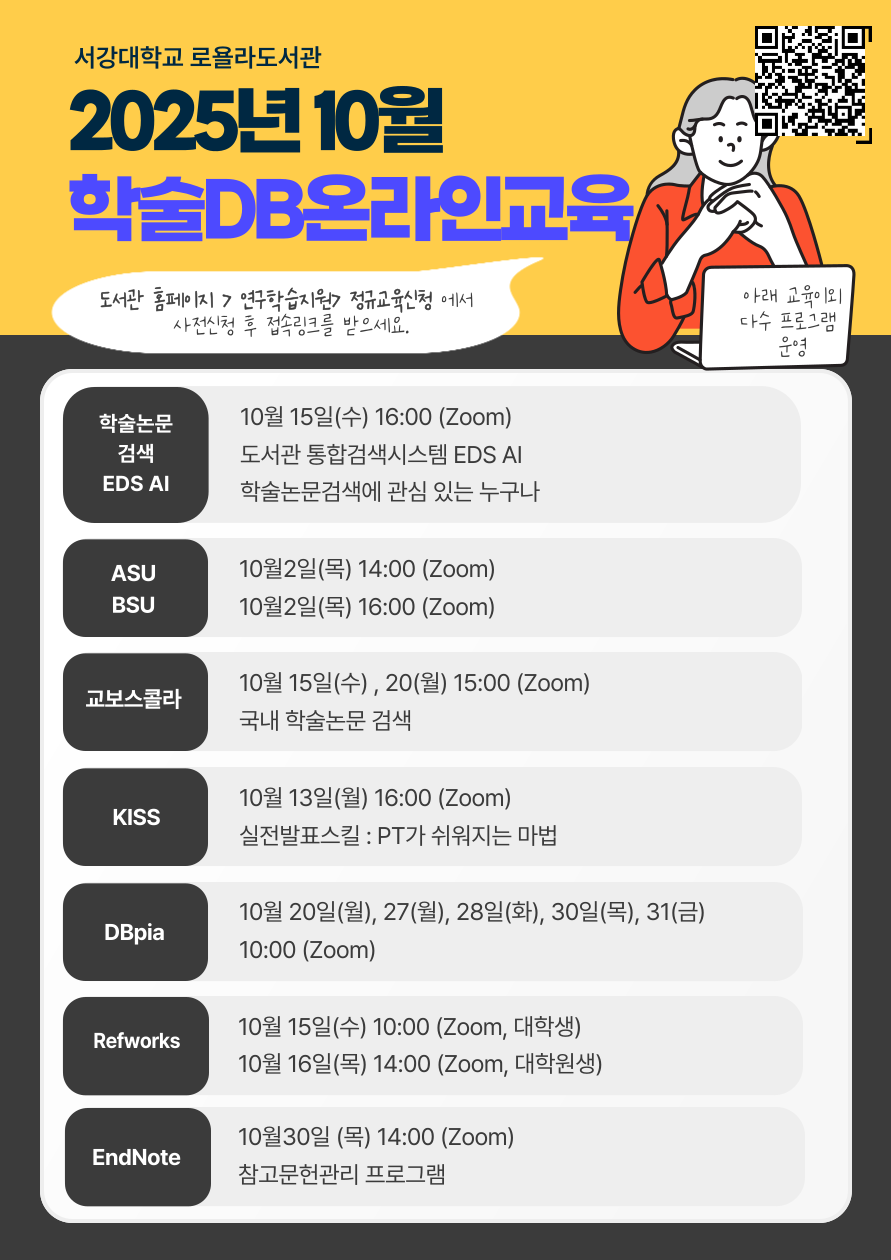 홈 sogang-event 교내행사 [도서관] 2025년 10월 학술DB교육 안내 sogang-event 교내행사 발전홍보팀 [도서관] 2025년 10월 학술DB교육 안내 작성자: 발전홍보팀 게시일: 2025. 10. 1. 오후 2:51:27 ▶교육신청링크 : https://library.sogang.ac.kr/bbs/content/1_62498