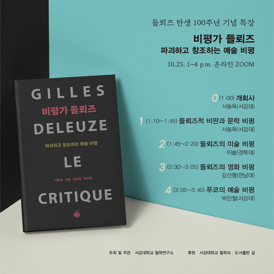 서강대학교 철학연구소는 20세기 프랑스 철학의 거장 질 들뢰즈(Gilles Deleuze, 1925~1995) 탄생 100주년을 맞아, 신간 『비평가 들뢰즈: 파괴하고 창조하는 예술 비평』 출간을 기념하는 학술 특강을 개최합니다.
