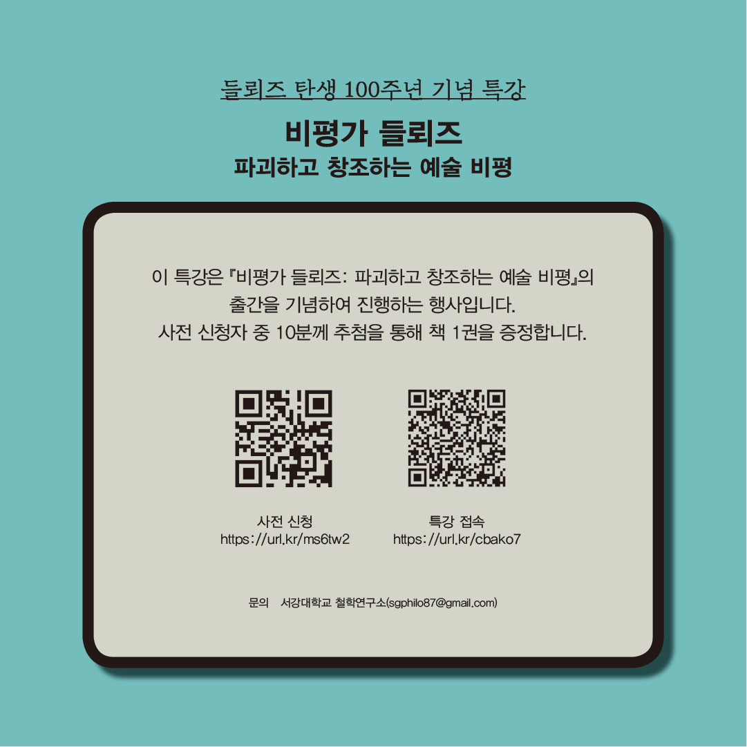 사전 신청자 중 추첨을 통해 『비평가 들뢰즈: 파괴하고 창조하는 예술 비평』(도서출판 길, 2025) 10권을 증정합니다. 관심 있는 분들의 많은 신청 바랍니다.(사전 신청 링크 https://url.kr/ms6tw2)