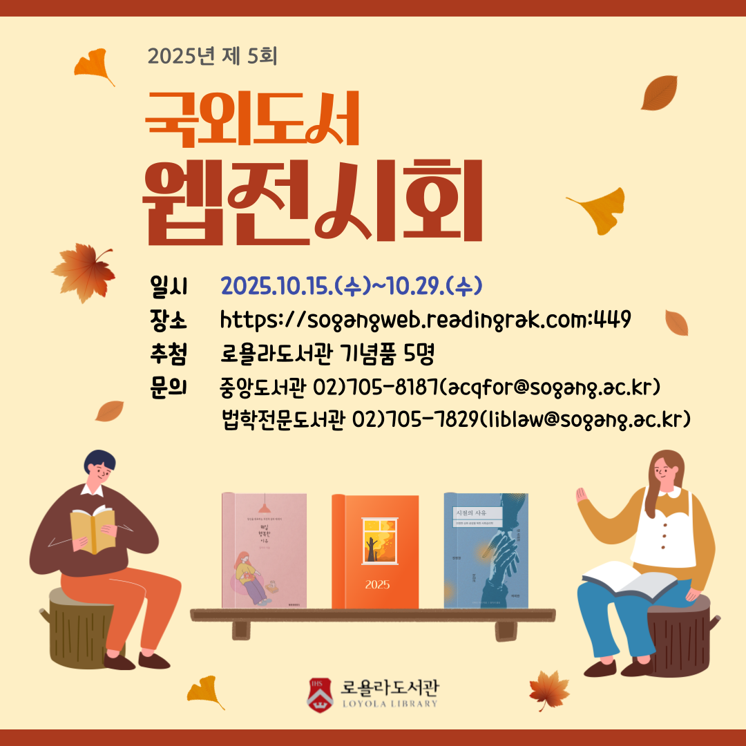 홈 sogang-event 교내행사 [도서관] 2025학년도 제5회 『국외도서 웹전시회』 (10/15~10/29) sogang-event 교내행사 발전홍보팀 [도서관] 2025학년도 제5회 『국외도서 웹전시회』 (10/15~10/29) 작성자: 발전홍보팀 게시일: 2025. 10. 15. 오전 11:14:26 ▶ 웹전시회 링크 : https://sogangweb.readingrak.com:449