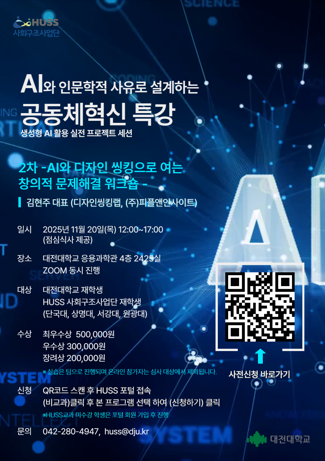 [HUSS 사회구조사업단] AI와 인문학적 사유로 설계하는 공동체혁신 특강 안내 (1차 ~11/11, 2차~11/18)