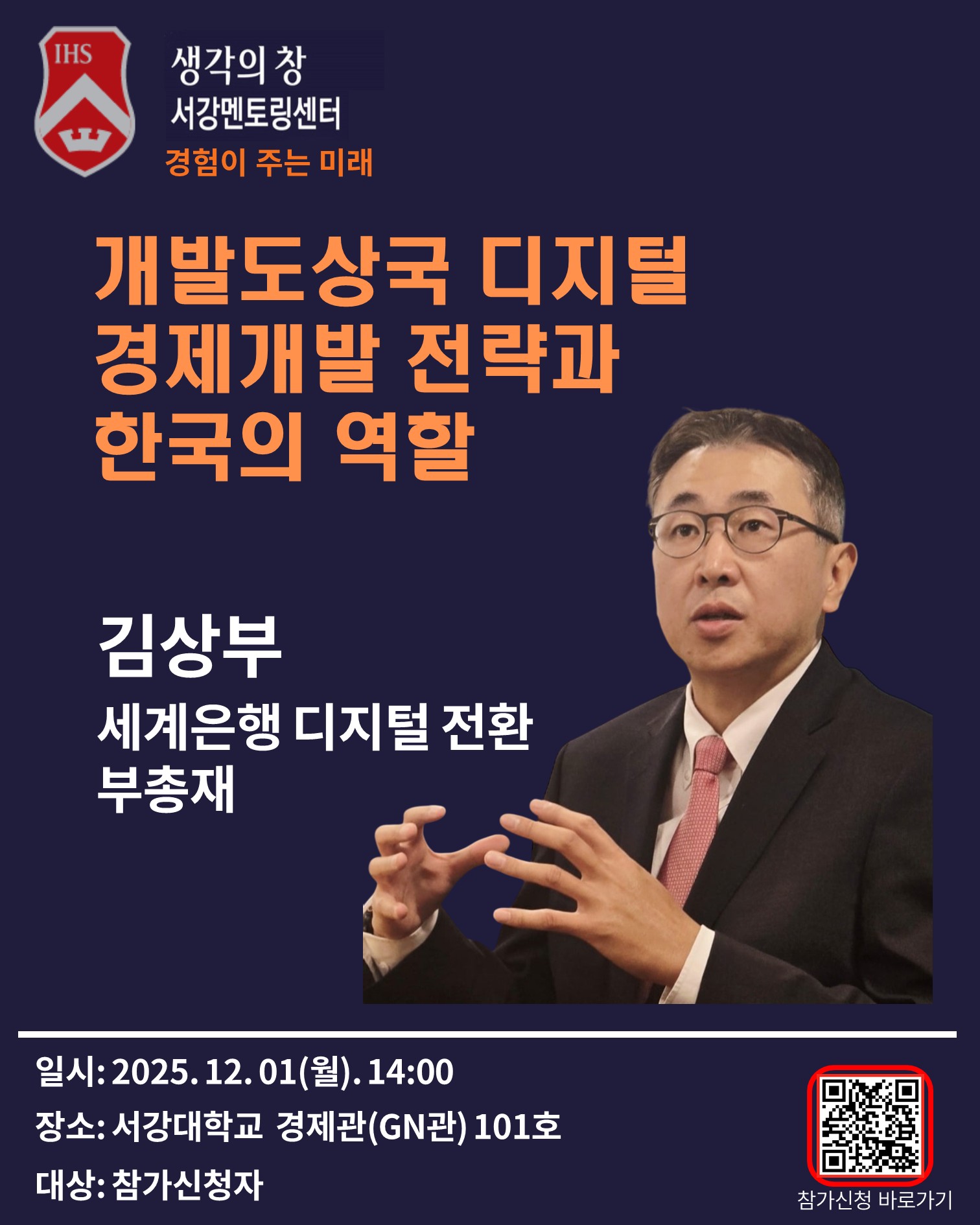 서강대학교 멘토링센터 ‘생각의 창’(공동센터장 박영선·김상용)은 오는 12월 1일(수) 오후 2시, 서강대학교 경제관(GN) 101호에서 세계은행(WB) 김상부 디지털전환 부총재를 초청해 여덟 번째 특강 「개발도상국 디지털 경제개발 전략과 한국의 역할」이라는 주제를 가지고 특강을 개최합니다.