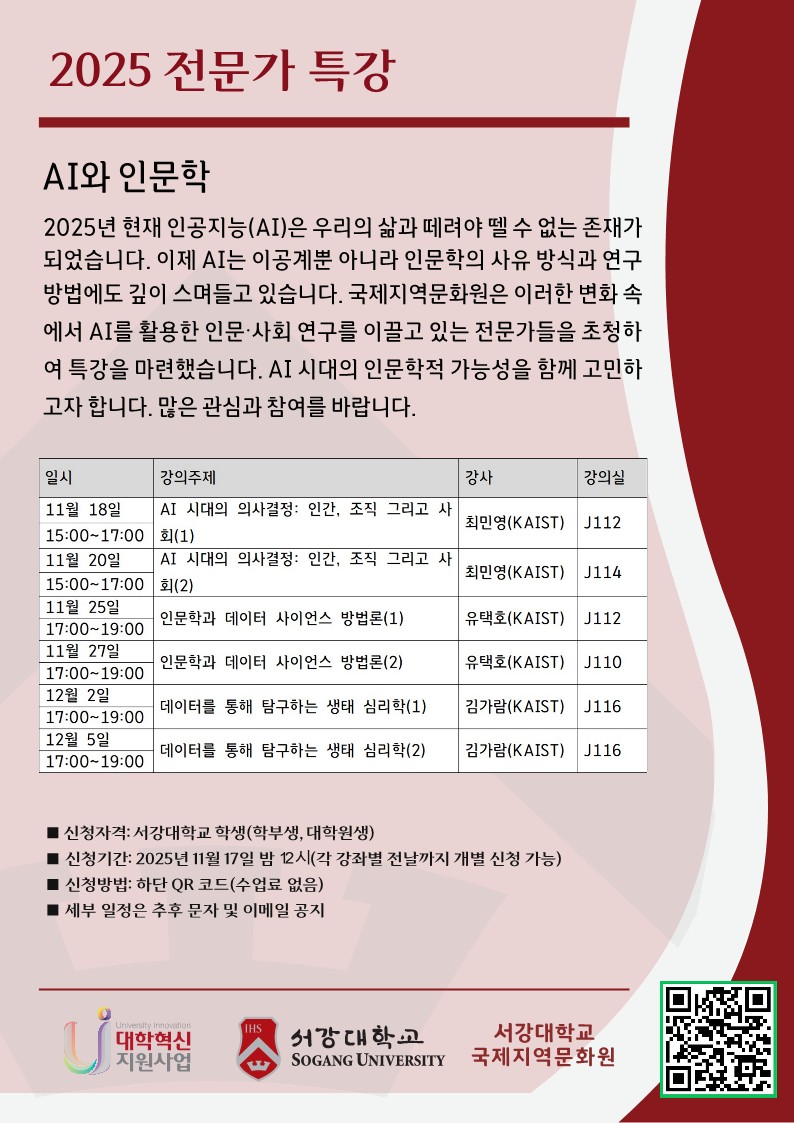 [국제지역문화원] 2025 전문가 특강 <AI와 인문학> 프로그램 신청 안내(~12/4)