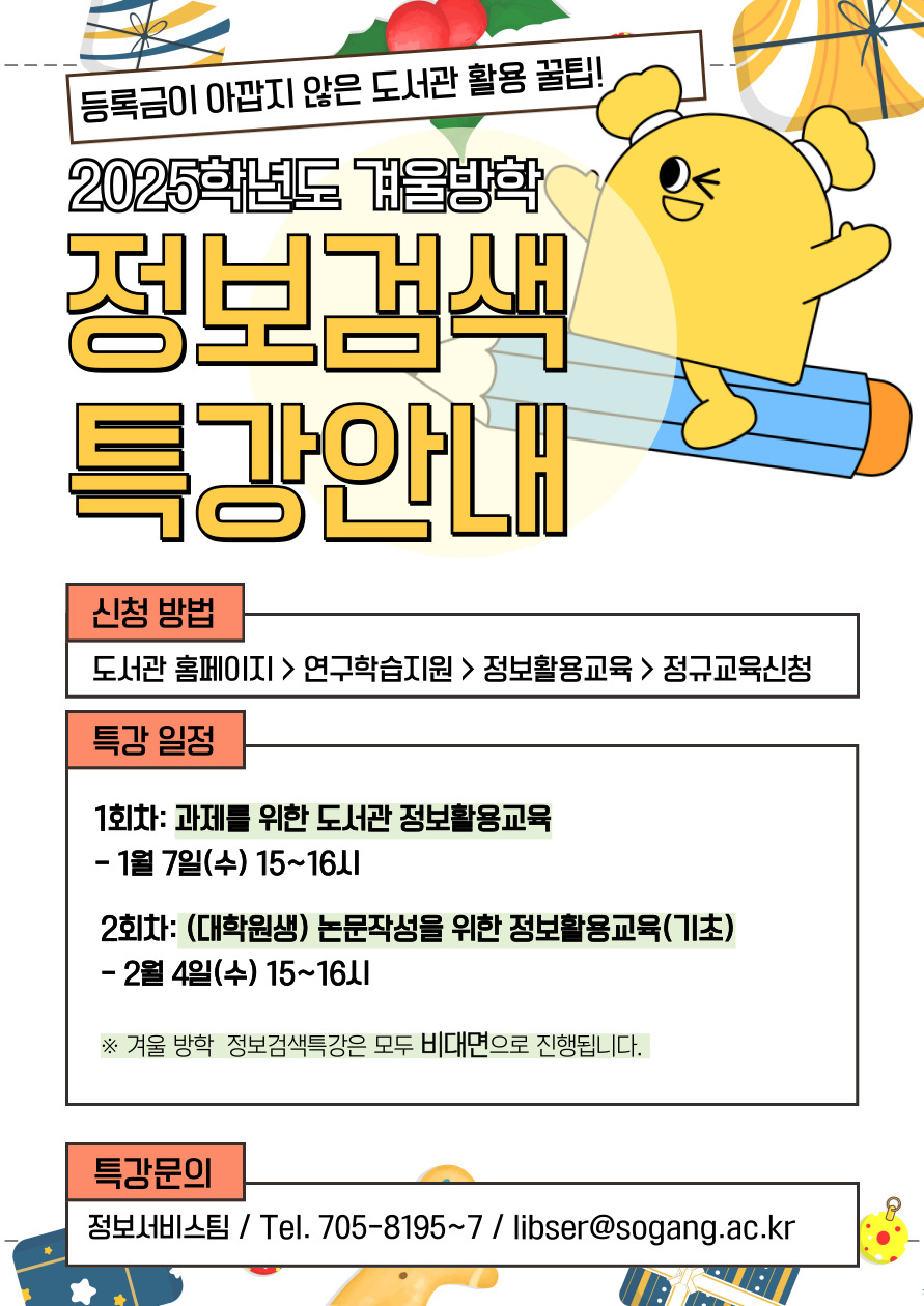 홈 sogang-event 교내행사 [도서관] 2025학년도 겨울방학 정보검색특강 일정 ( 1/7, 2/4) sogang-event 교내행사 발전홍보팀 [도서관] 2025학년도 겨울방학 정보검색특강 일정 ( 1/7, 2/4) 작성자: 발전홍보팀 게시일: 2025. 12. 18. 오후 2:16:36