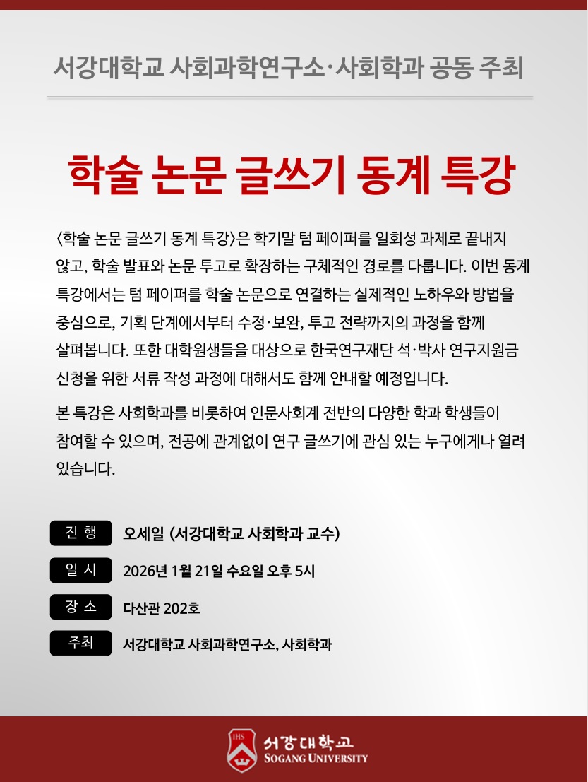 홈 sogang-event 교내행사 [사회학과] 학술 논문 글쓰기 동계 특강 (1/21) sogang-event 교내행사 발전홍보팀 [사회학과] 학술 논문 글쓰기 동계 특강 (1/21) 작성자: 발전홍보팀 게시일: 2026. 1. 20. 오전 11:34:48