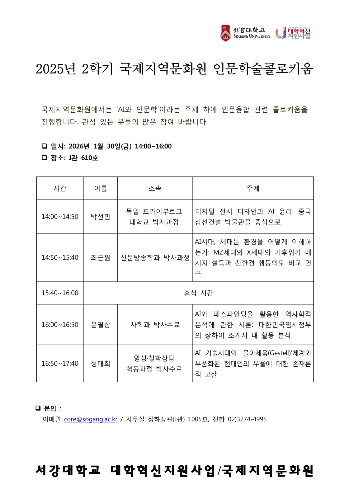 홈 sogang-event 교내행사 [국제지역문화원] 인문학술콜로키움 개최 안내(1/30) sogang-event 교내행사 발전홍보팀 [국제지역문화원] 인문학술콜로키움 개최 안내(1/30) 작성자: 발전홍보팀 게시일: 2026. 1. 27. 오후 1:06:28 첨부파일 2025년 2학기 인문학술콜로키움 발표.pdf