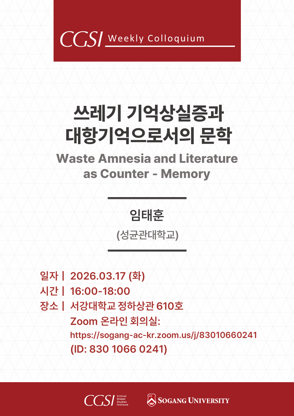 서강대학교 트랜스내셔널인문학연구소에서는 임태훈 선생님을 모시고 콜로키움을 개최하고자 합니다. ‘쓰레기 기억상실증’은 폐기물 처리 시스템을 거치며 배출자의 기억이 익명화되고 비가시화되는 집단적 망각 현상을 의미합니다. 폐기물 처리 시스템은 오물을 수거 매립 소각 재활용하는 물리적 공정인 동시에, 소비 대중의 집단적 망각을 체계적으로 관리하고 지원하는 공공 서비스입니다. 이번 발표에서는 임태훈 선생님의 최신 저서인『쓰레기 기억상실증』의 주요 내용을 소개하며, 난지도 매립장에서부터 반투명 종량제 봉투, 하수도와 정화조, 살처분과 특수청소 현장에서 망각의 인프라가 작동하는 방식을 차례로 분석할 예정입니다. 또한 이러한 망각의 흐름을 거스르는 대항 기억의 장소가 문학임을 이야기하는 것이 이번 발표의 핵심이며, 지워진 존재의 목소리를 기록하고 혐오와 배제의 논리가 관철되는 쓰레기 정치학에 균열을 내는 작품들을 소개할 예정입니다. 관심 있는 분들의 많은 참여를 부탁드립니다.
