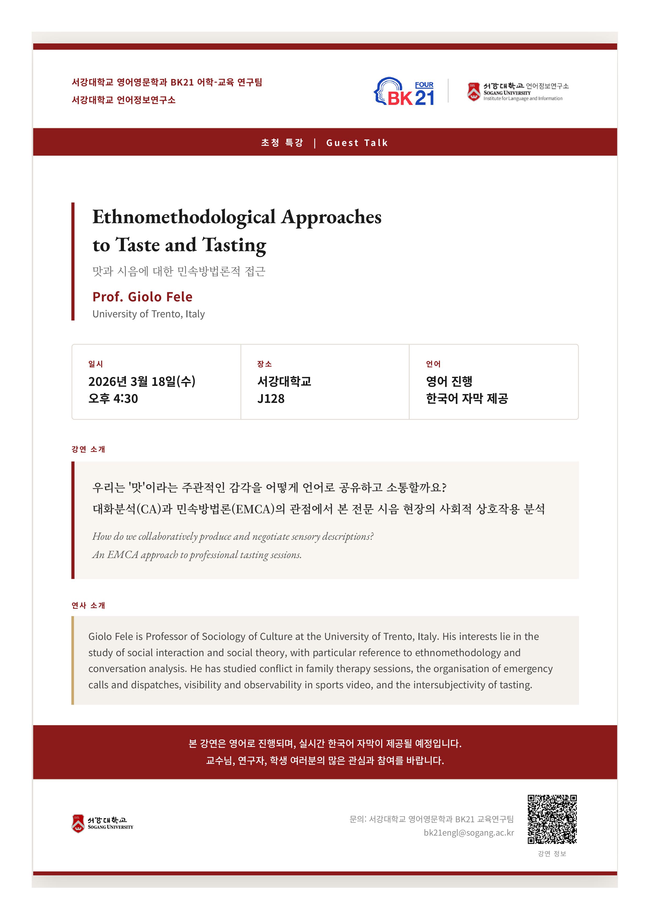 영어영문학과 BK21 어학-교육 연구팀과 언어정보연구소가 공동으로 Prof. Giolo Fele(University of Trento, Italy) 교수님을 모시고 초청 특강을 개최합니다. 이번 강연에서는 '맛'이라는 감각적 경험이 어떻게 사회적으로 공유되고 소통되는지를 민속방법론(Ethnomethodology)과 대화분석(Conversation Analysis)의 관점에서 살펴봅니다.