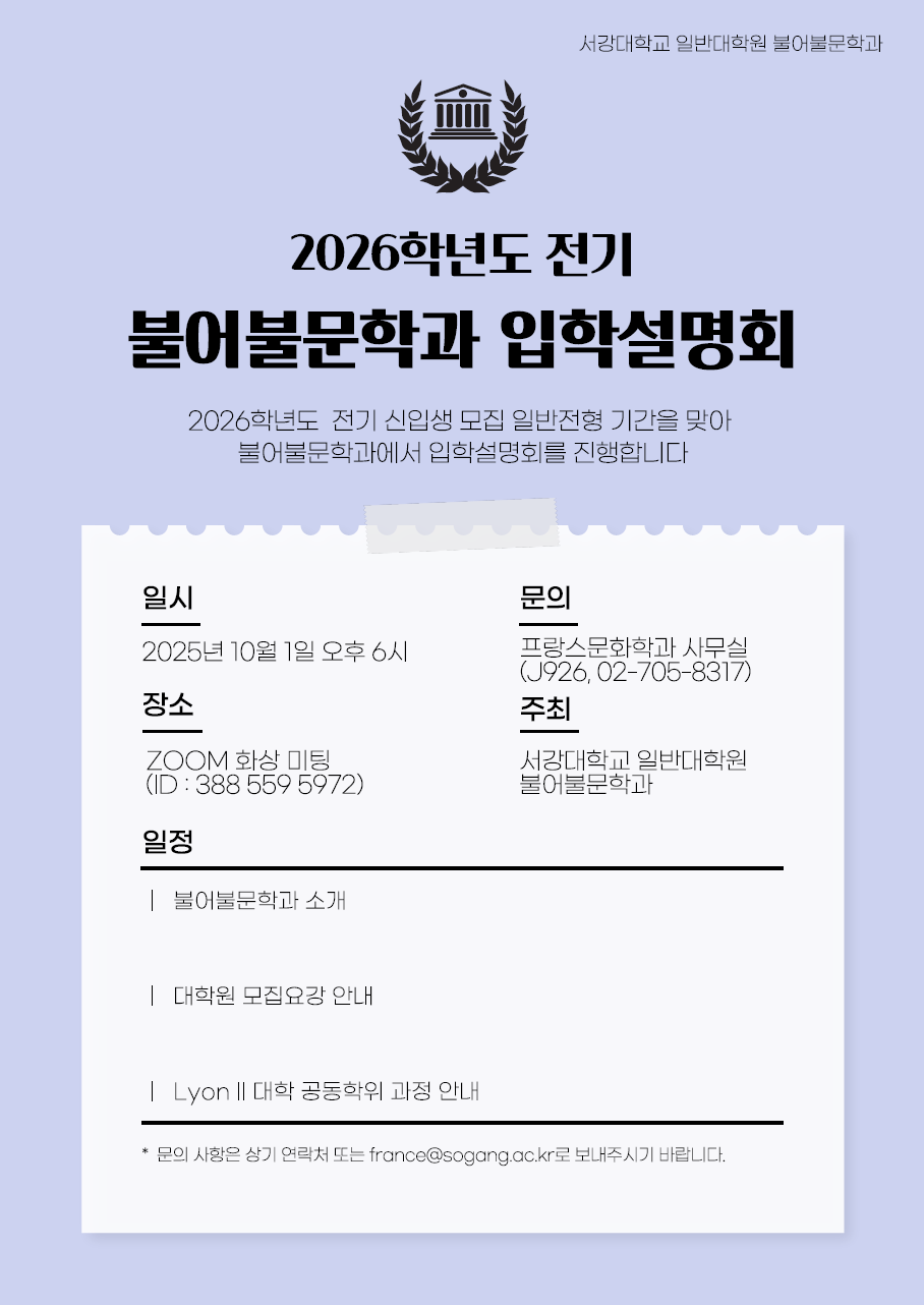 홈 sogang-france 공지사항 2026학년도 전기 불어불문학과 대학원 입학설명회 안내 sogang-france 공지사항 2026학년도 전기 불어불문학과 대학원 입학설명회 안내 작성자: 프랑스문화전공 게시일: 2025. 10. 1. 오전 12:00:00