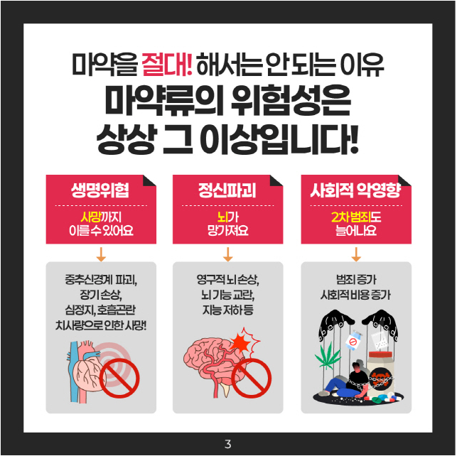 마약류 중독 시 중추신경계 파괴, 심혈관계 손상으로 생명의 위협을 가하고, 장기적으로 남용할 경우 뇌 기능 저하와 정신 변화를 초래할 수 있습니다. 또한 범죄에 노출될 수 있으며, 이로 인한 2차 범죄로 위험에 놓일 수 있습니다.