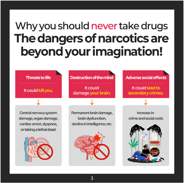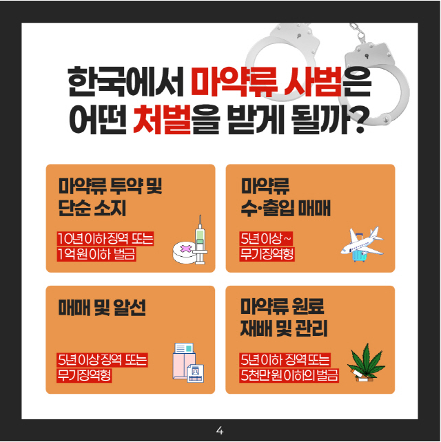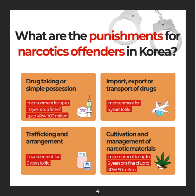 As drug-related issues continue to grow in severity worldwide, we would like to provide the following information to help ensure a safe and healthy campus life for our international students. South Korea strictly regulates all types of narcotics, including cocaine, opium, ketamine, cannabis, and methamphetamine (also known as Philopon), and the legal penalties for violations are extremely severe.