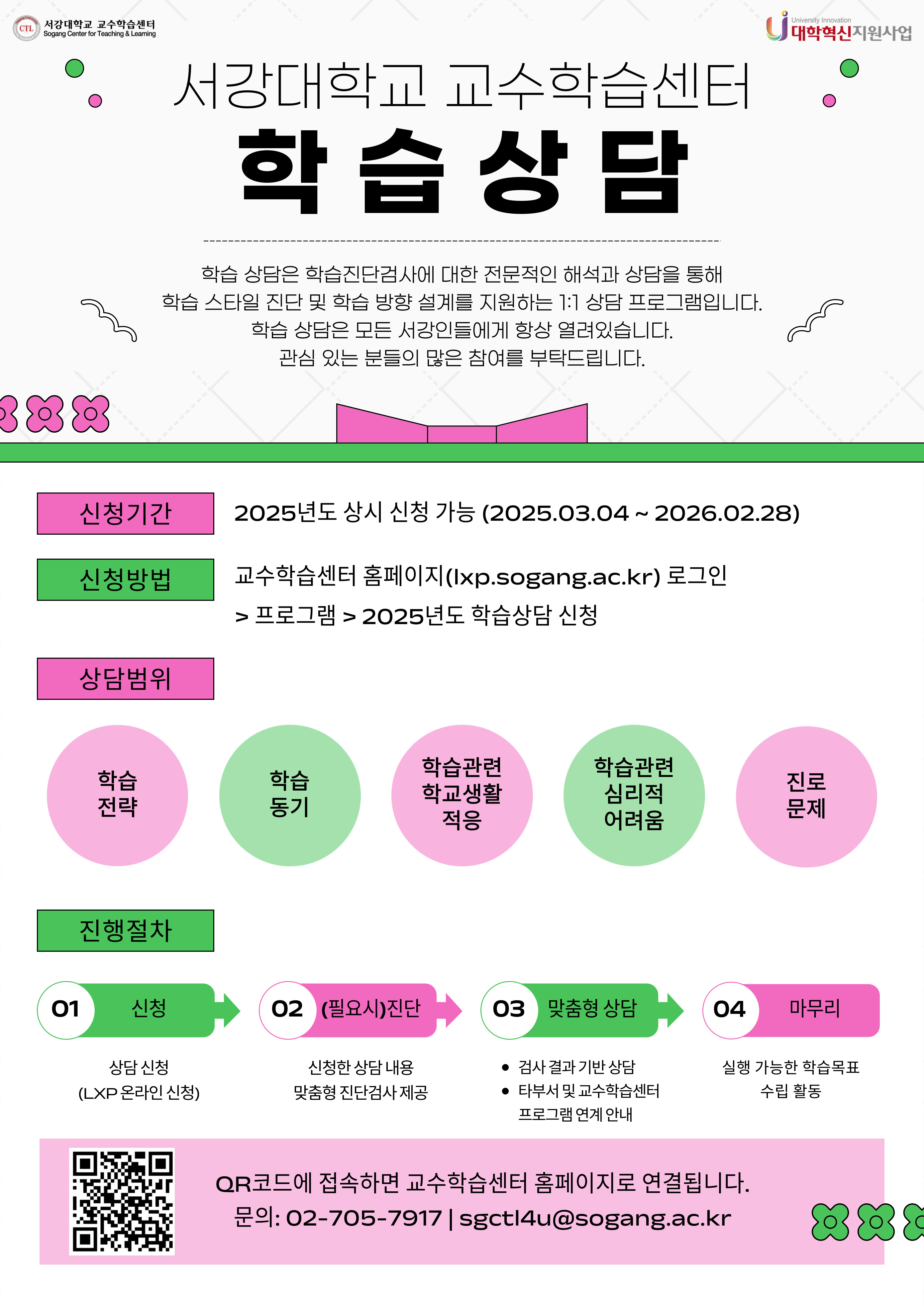 홈 sogang-general 일반공지 [교수학습센터] 2025학년도 학습상담 안내 (~2/28) sogang-general 일반공지 발전홍보팀 [교수학습센터] 2025학년도 학습상담 안내 (~2/28) 작성자: 발전홍보팀 게시일: 2025. 9. 22. 오후 3:20:13