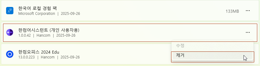 나. 한컴어시스턴트 (개인 사용자용) 프로그램 삭제