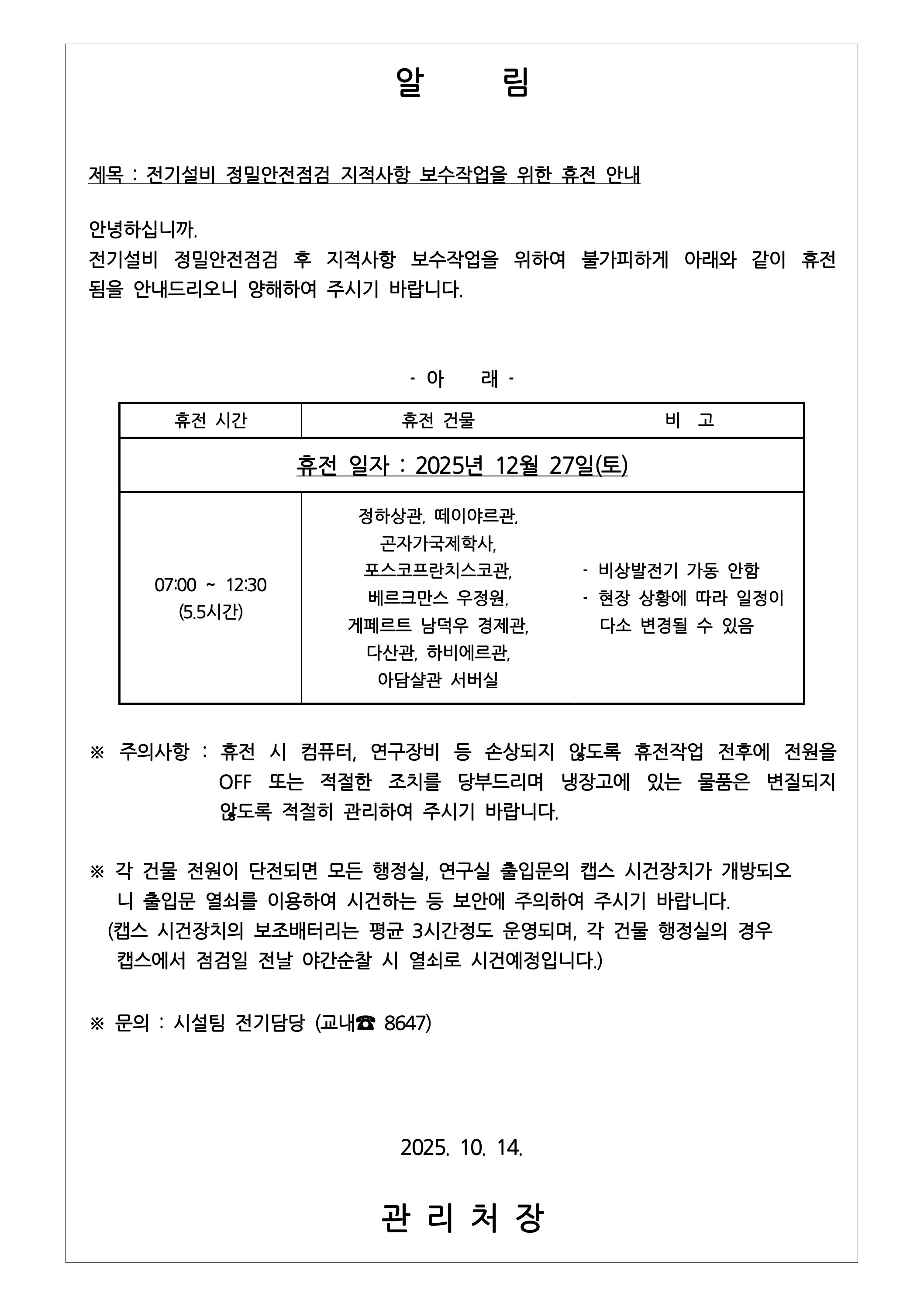 홈 sogang-general 일반공지 [시설팀] 전기설비 정밀안전점검 지적사항 보수작업을 위한 휴전 안내(12/27) sogang-general 일반공지 발전홍보팀 [시설팀] 전기설비 정밀안전점검 지적사항 보수작업을 위한 휴전 안내(12/27) 작성자: 발전홍보팀 게시일: 2025. 10. 14. 오후 1:40:34