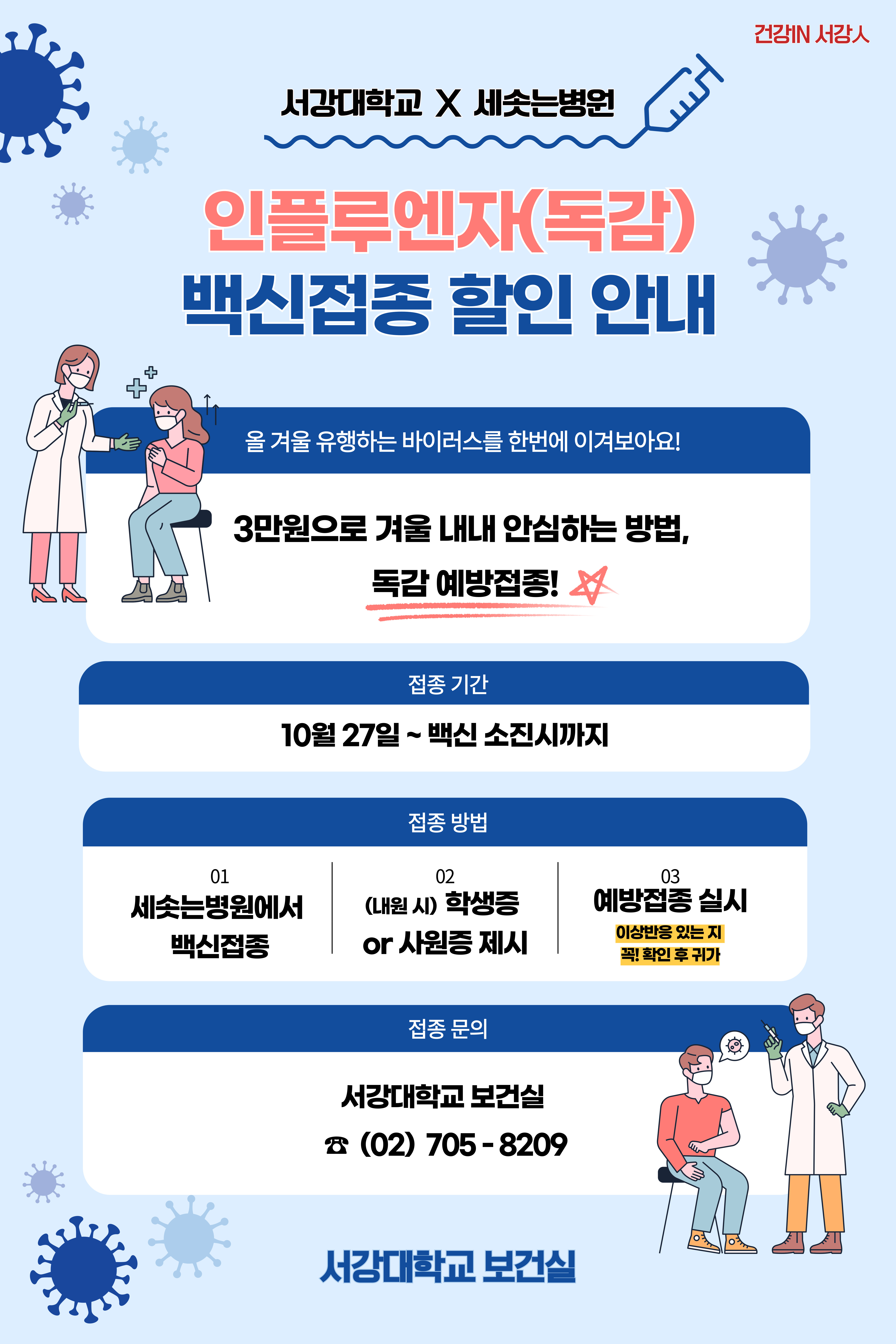 서강대학교 학우분들과 교직원 여러분들을 대상으로 인플루엔자(독감) 바이러스 예방을 위해 독감백신 접종가 할인 이벤트를 진행하고자 하오니 많은 참여 바랍니다.