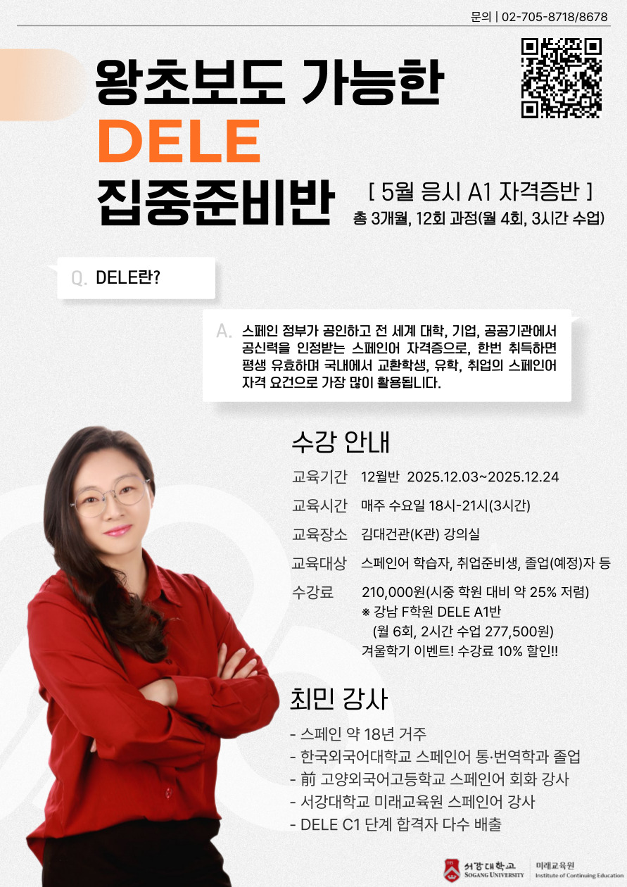 홈 sogang-general 일반공지 [미래교육원] 스페인어 DELE A1 집중 준비반 수강생 모집 sogang-general 일반공지 발전홍보팀 [미래교육원] 스페인어 DELE A1 집중 준비반 수강생 모집 작성자: 발전홍보팀 게시일: 2025. 10. 30. 오후 1:07:15 ♠서강대학교 미래교육원 스페인어 과정 바로가기 ☞클릭 첨부파일 DELE 소개 및 A1 과정 안내.pdf
