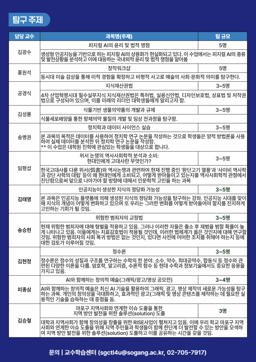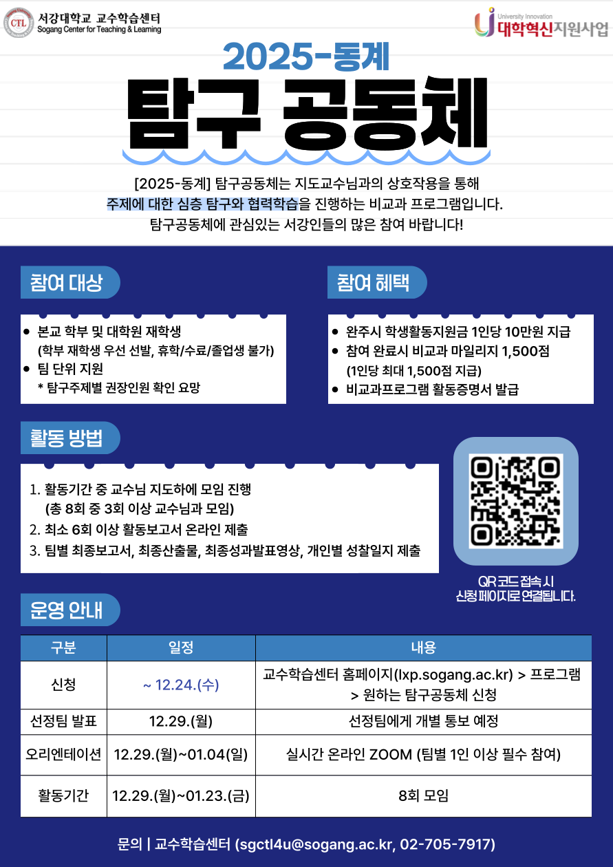 홈 sogang-general 일반공지 [교수학습센터] 2025-동계 탐구 공동체 (~12/24) sogang-general 일반공지 발전홍보팀 [교수학습센터] 2025-동계 탐구 공동체 (~12/24) 작성자: 발전홍보팀 게시일: 2025. 12. 15. 오후 4:37:55
