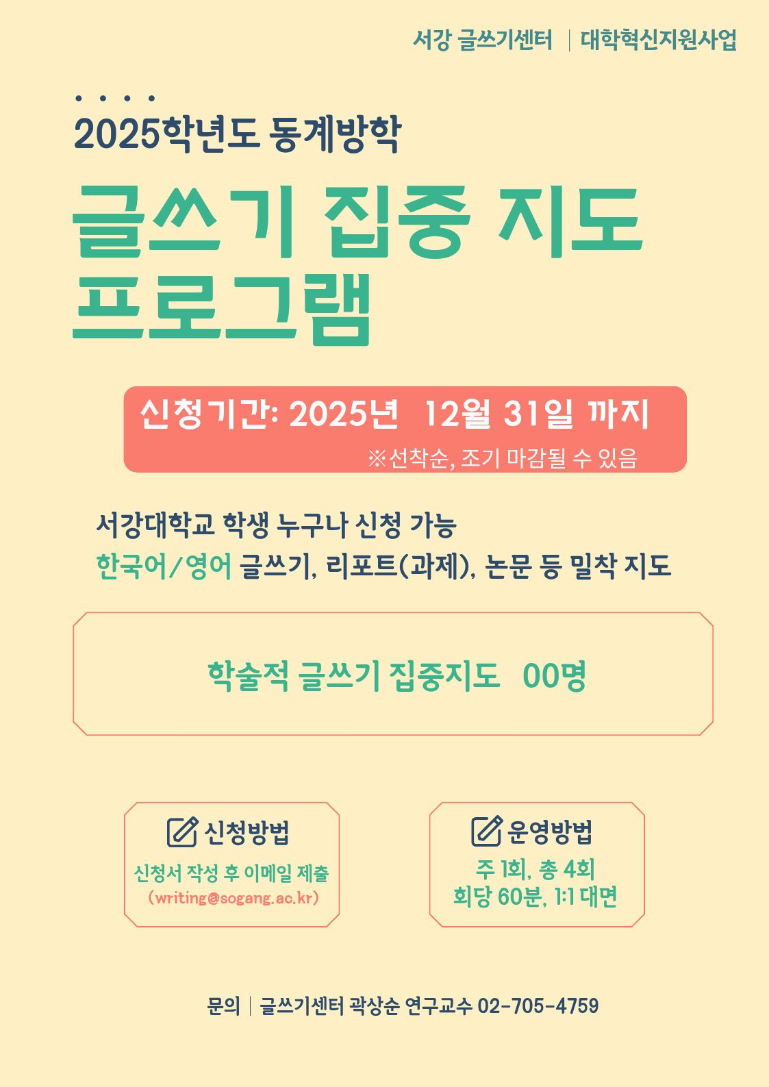 홈 sogang-general 일반공지 [글쓰기센터] 2025학년 동계방학 글쓰기 집중지도 프로그램 모집 안내 (~12/31) sogang-general 일반공지 발전홍보팀 [글쓰기센터] 2025학년 동계방학 글쓰기 집중지도 프로그램 모집 안내 (~12/31) 작성자: 발전홍보팀 게시일: 2025. 12. 17. 오전 9:07:53 첨부파일 글쓰기 집중 지도 프로그램 신청서 2025_동계.hwp 글쓰기 집중 지도 프로그램 신청서 2025_동계.docx