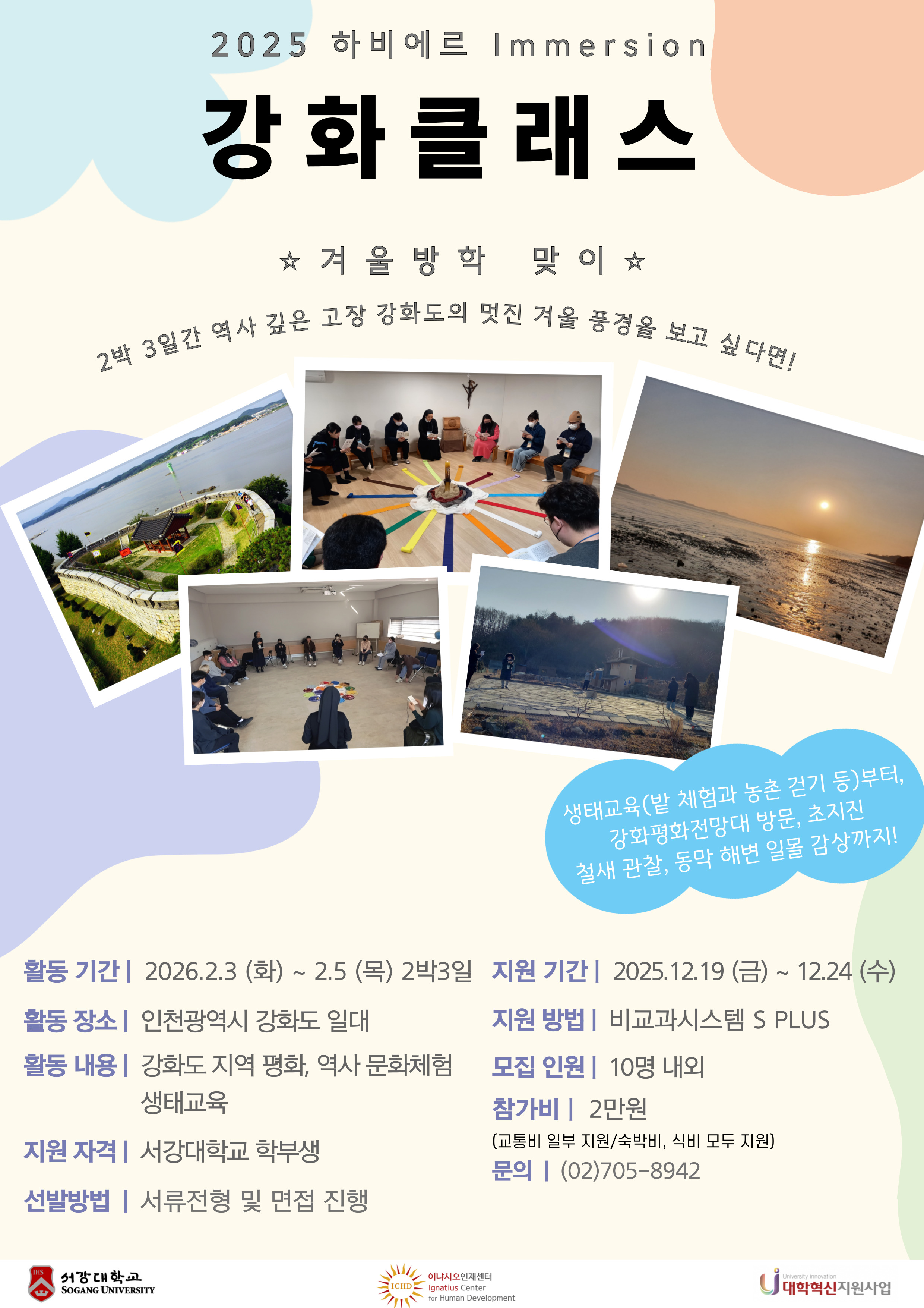홈 sogang-general 일반공지 [이냐시오인재센터] "2025 하비에르 Immersion-강화클래스" 참가자 모집(~12/24까지) sogang-general 일반공지 발전홍보팀 [이냐시오인재센터] "2025 하비에르 Immersion-강화클래스" 참가자 모집(~12/24까지) 작성자: 발전홍보팀 게시일: 2025. 12. 19. 오후 4:33:12 *참고사항 : S PLUS 신청은 12.22(월)부터 가능합니다. 첨부파일 2025 하비에르 Immersion-강화클래스 포스터.jpg