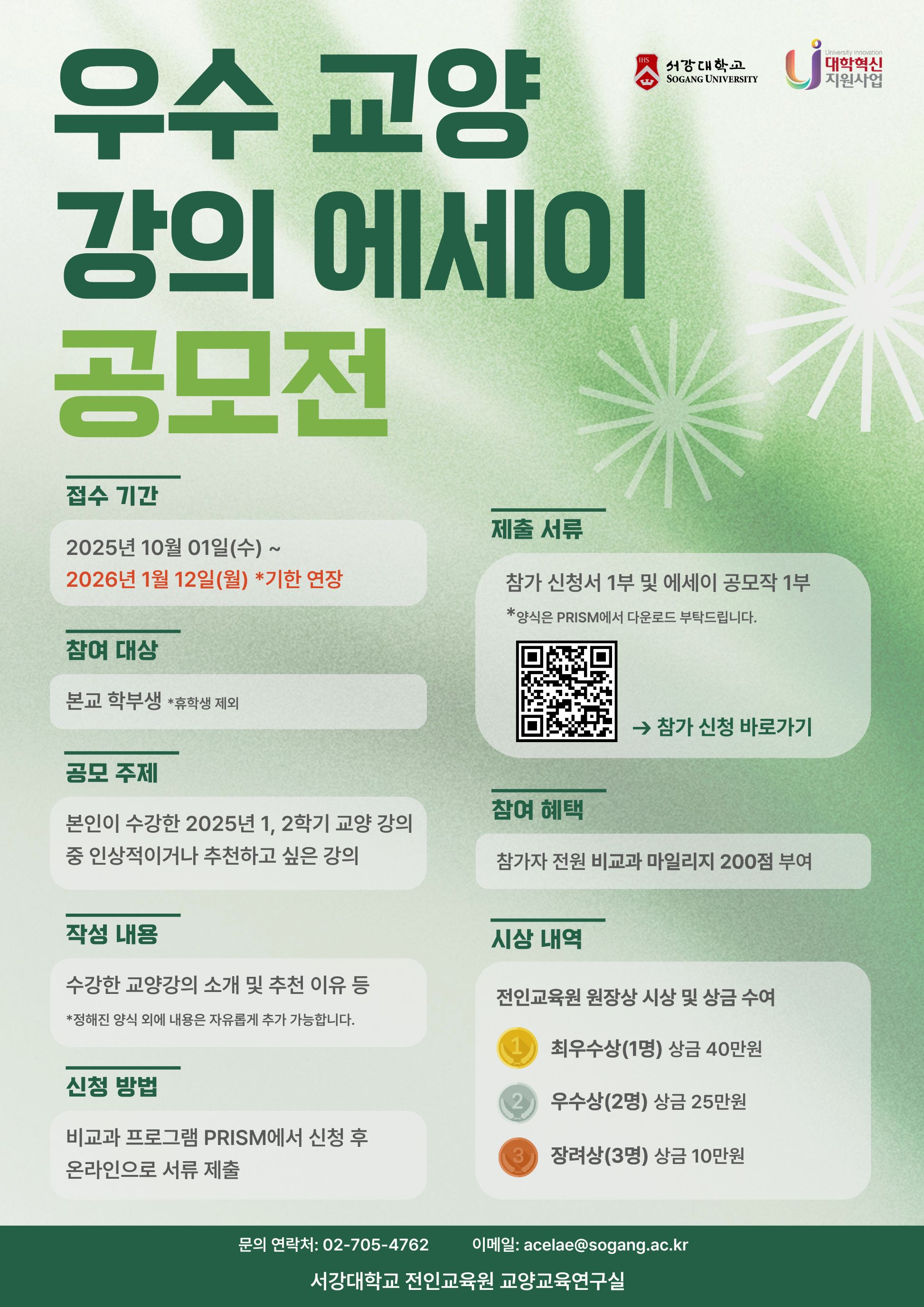 [전인교육원] 우수 교양 강의 에세이 공모전 (기한 연장, ~1/12)