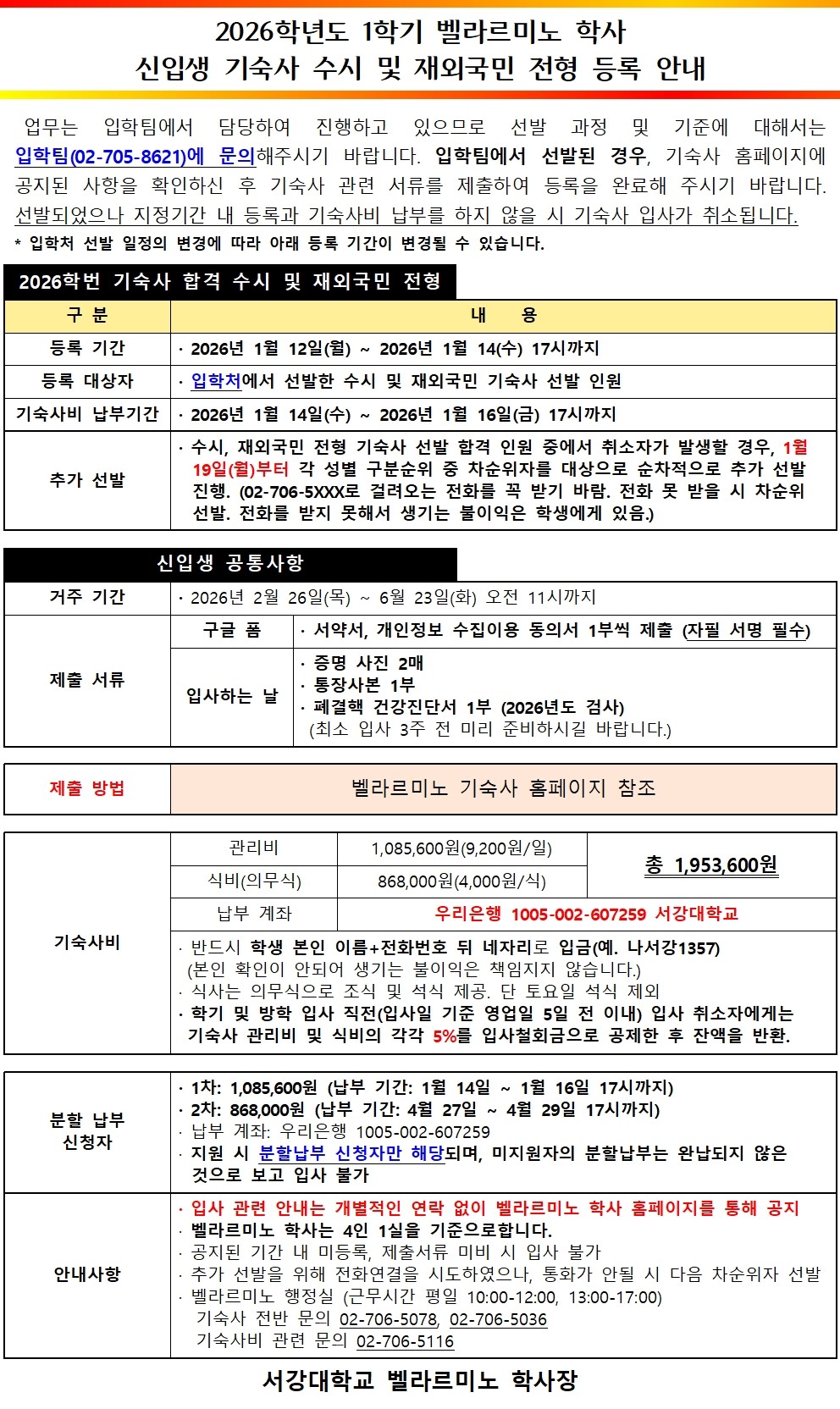 홈 sogang-general 일반공지 [벨라르미노학사] 2026학년도 1학기 벨라르미노 학사 신입생 기숙사 수시 및 재외국민 전형 등록 안내(~1/14) sogang-general 일반공지 발전홍보팀 [벨라르미노학사] 2026학년도 1학기 벨라르미노 학사 신입생 기숙사 수시 및 재외국민 전형 등록 안내(~1/14) 작성자: 발전홍보팀 게시일: 2025. 12. 29. 오전 11:50:03 첨부파일 2. 2026학년도 1 신입생(수시 및 재외국민) 입사 등록 안내(학교 공지용).jpg