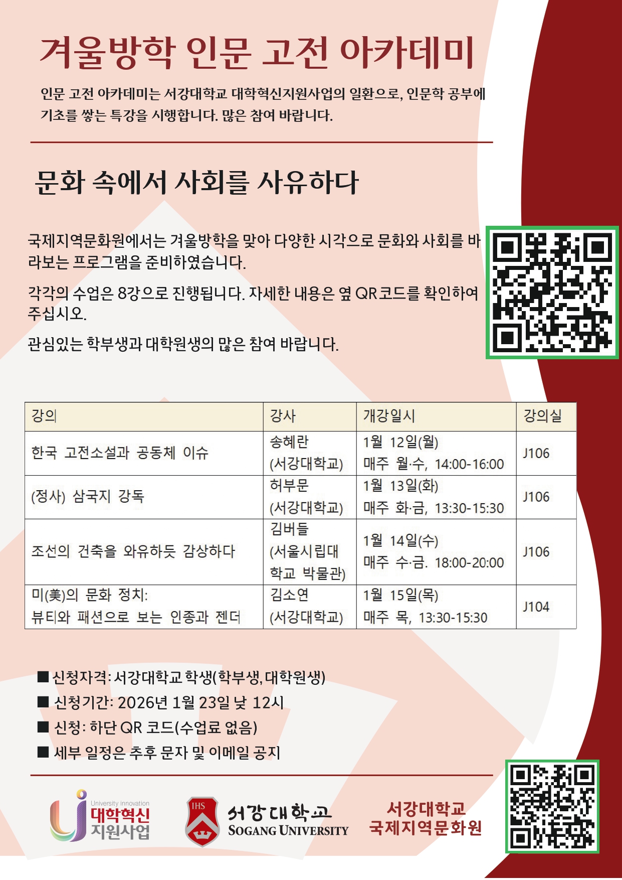 국제지역문화원에서는 겨울방학을 맞아 다양한 시각으로 문화와 사회를 바라볼 수 있는 프로그램을 준비하였습니다.