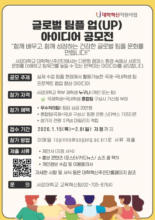 홈 sogang-general 일반공지 [교육혁신팀] 글로벌 팀플 업(UP) 아이디어 공모전 (~2/8) sogang-general 일반공지 발전홍보팀 [교육혁신팀] 글로벌 팀플 업(UP) 아이디어 공모전 (~2/8) 작성자: 발전홍보팀 게시일: 2026. 1. 14. 오후 4:02:15 첨부파일 개인정보 수집·이용 동의서.hwp 제안서.hwp